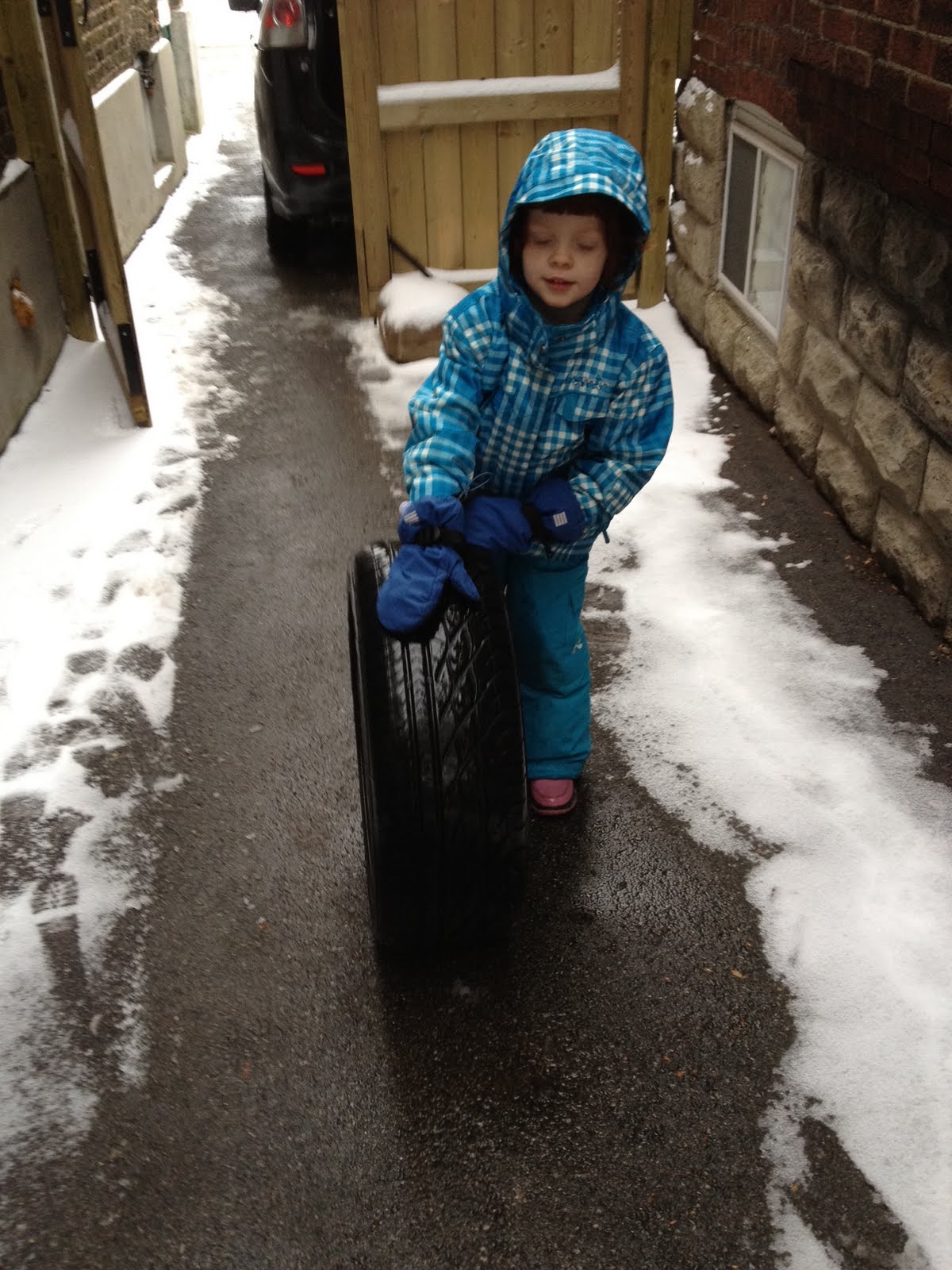 Today I had the winter tires put on the car. When it was time to pick the car up Charlotte and ruby both came with me. When we got home and I began to unload the tires from the trunk they both asked questions about what I was doing. And hen they both asked if they could help. They were thrilled with the opportunity of rolling the tires up the driveway to the garage. Sure one of them fell on Charlotte's foot but she figured out what to do.