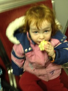 Ruby is one of the hungriest people I know. These days, she seems willing to eat just about anything, anywhere. Often it is amusing. Sometimes it is confounding – say – for example when we are in the way to school and she is just Into the stroller and announces “I hungee” after just eating a full breakfast. And usually some of my breakfast as well. I'm leading to be prepared for this but she still catches me off guard sometimes. And then there are other times when all the charm of the ravenous two year old is gone and the downstream consequences are just completely overwhelming. Think law of conservation of mass. Couple this with her complete and outright refusal to use the toilet or the potty and I have a Serious situation on my hands.