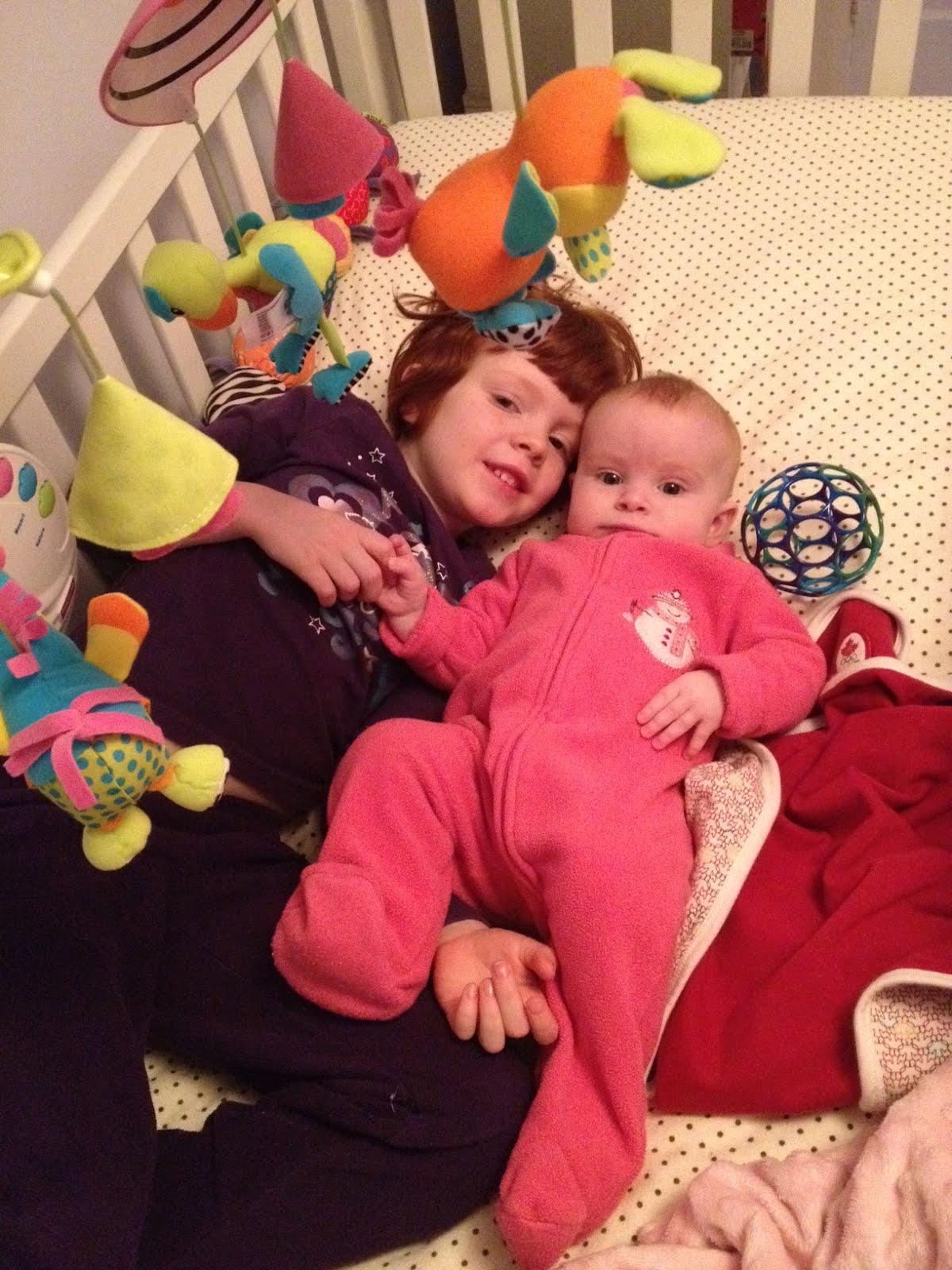 It has become charlottes routine to climb into the crib with Arden after she wakes herself up and get stressed. They giggle, make faces at each other, laugh a little bit, stare at the mobile, and wait for the rest of the family to get themselves going. And it is pretty amazing to watch the friendship developing.