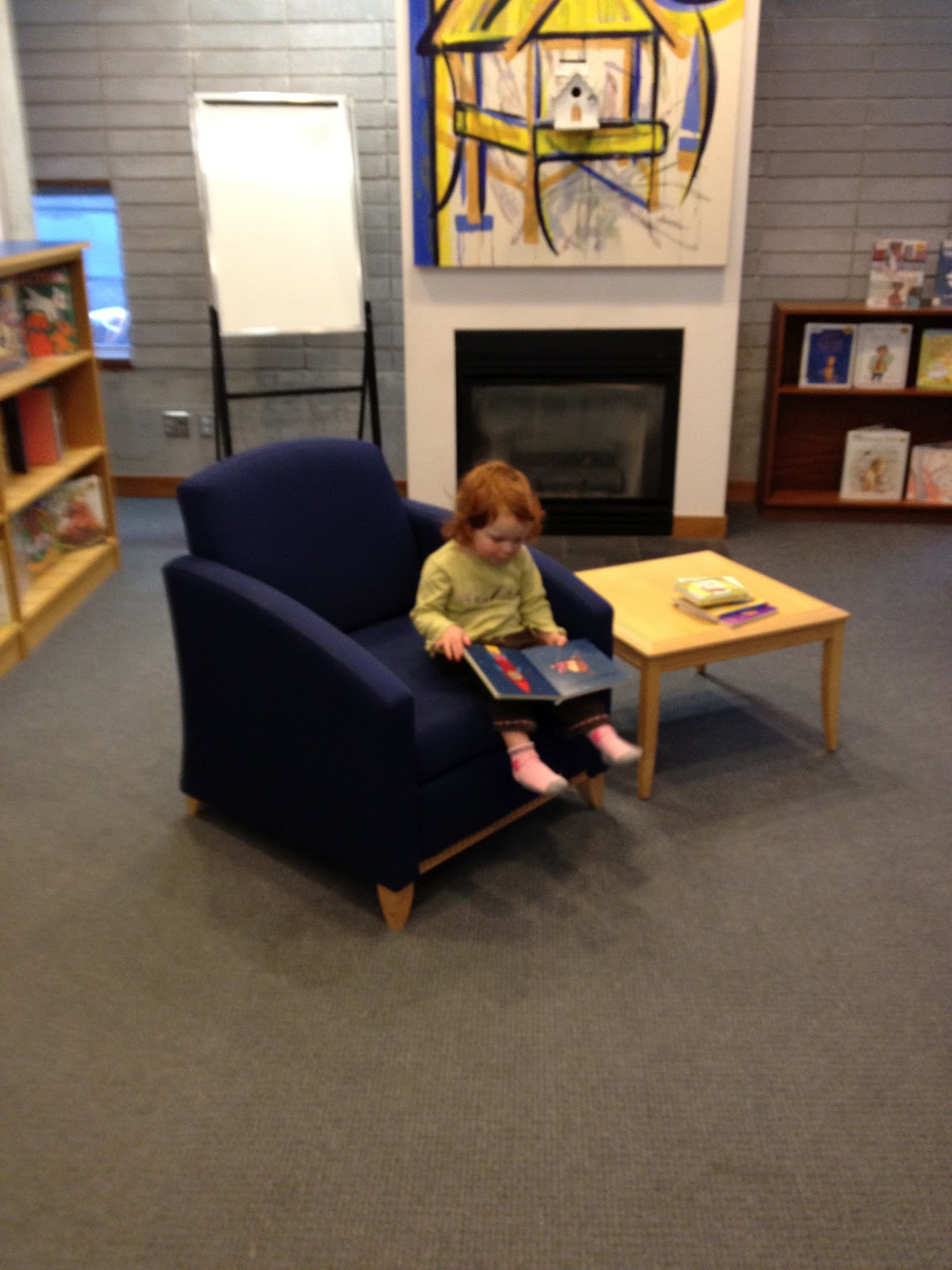 With the above hiccups out of the way, she really does have a lot going for her right now. For starters, Hil and I are pretty amazed at her ability to learn the words to stories and songs. I think it is reasonable to suggest that, right now, she has between 5 and 10 books memorized. Her elocution isn’t perfect – but if you stop mid sentence, she can usually fill in the blanks on the books she knows. And she has a real lhunger for new stories. “Something new” has become one of her favourite phrases to use. She loves to wander through the library pulling books off the shelves. I actually had to apologize to a librarian for the large amount of re-shelving work she created this week – but the librarian didn’t seem to mind. At one point during this week’s visit, I found her like this: