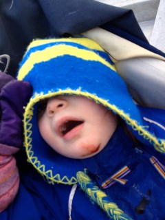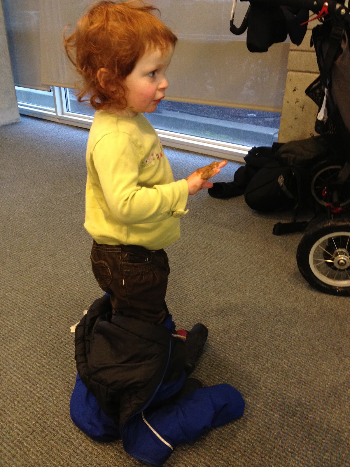 For the most part, they are all good things. For the most part. Some of them are not good things – like this morning when she stood up on the dining room chair, leaned over the chair back, tipped the chair over and narrowly missed slicing her forehead open on the baseboard. Or there was also the time this week when she decided to jump off the moving stroller and landed, chin first, on the cement retaining wall of the raised garden bed we were walking beside. See bloodly chin below. And there was also the time this week when, just as she was taking her snowsuit off at the library during our regular Tuesday visit, she decided to stick her hand down the back of her pants, subsequently getting her hand covered in… well, you know what her hand got covered in. Ever tried to give a 2.5 year old a bath in the sink of a library washroom while random kids who have arrived at the library for some afterschool time are banging on the door. Its an adventure.