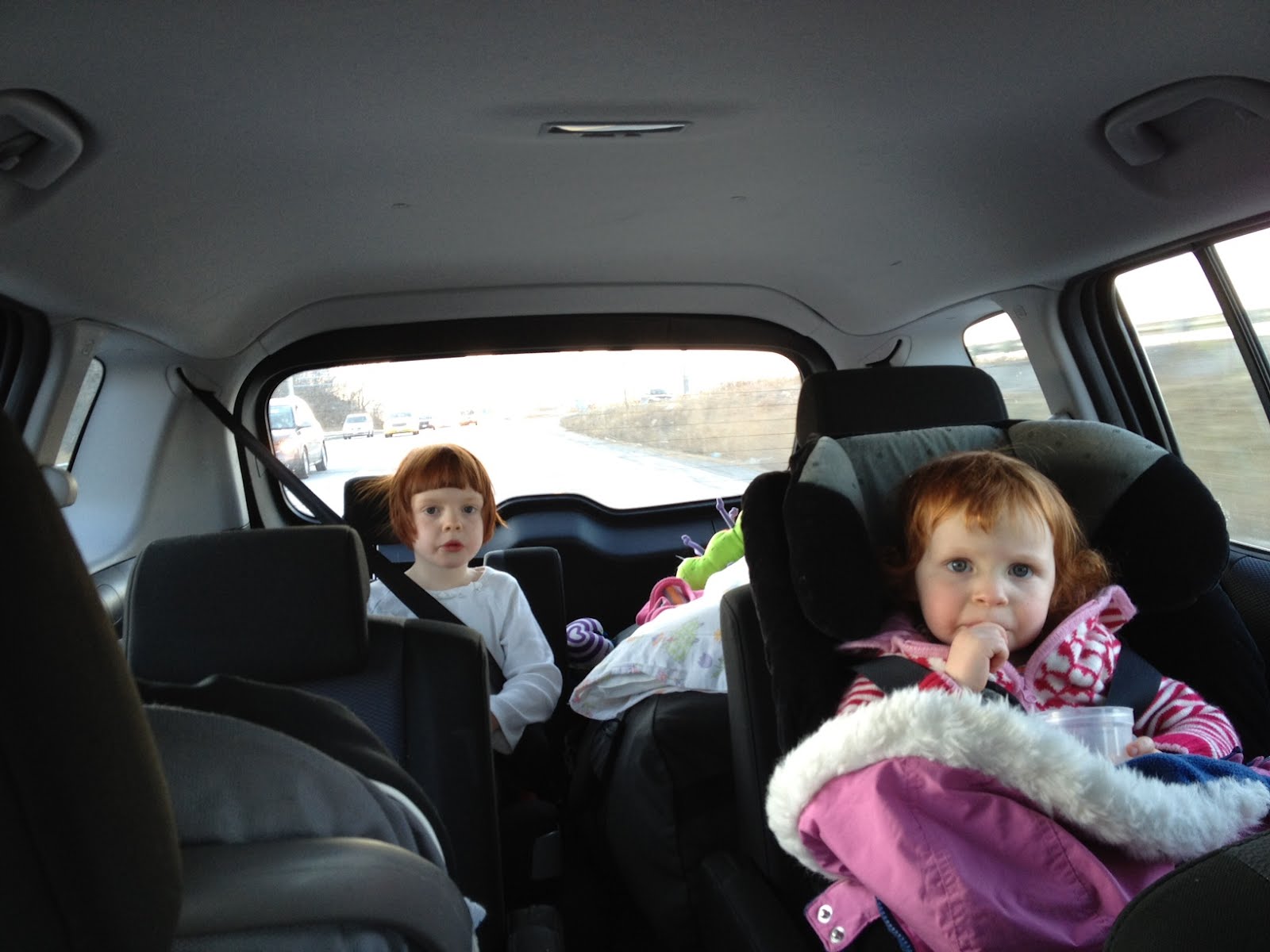 Hil pointed out that being in the car with this many people, this much stuff, and all these snacks, is a bit like playing a game of jenga. You have to move the kids books every so slightly and at just the right angle in order to get to the peanut butter sandwiches. You can stop so mom can breast feed in the rexalll parking lot, but only if you use some bundled up snow pants as a nursing pillow. And you can keep the change for the toll bridge handy in the cup holder but only if you keep the directions on the dash and the water bottles under the seat.