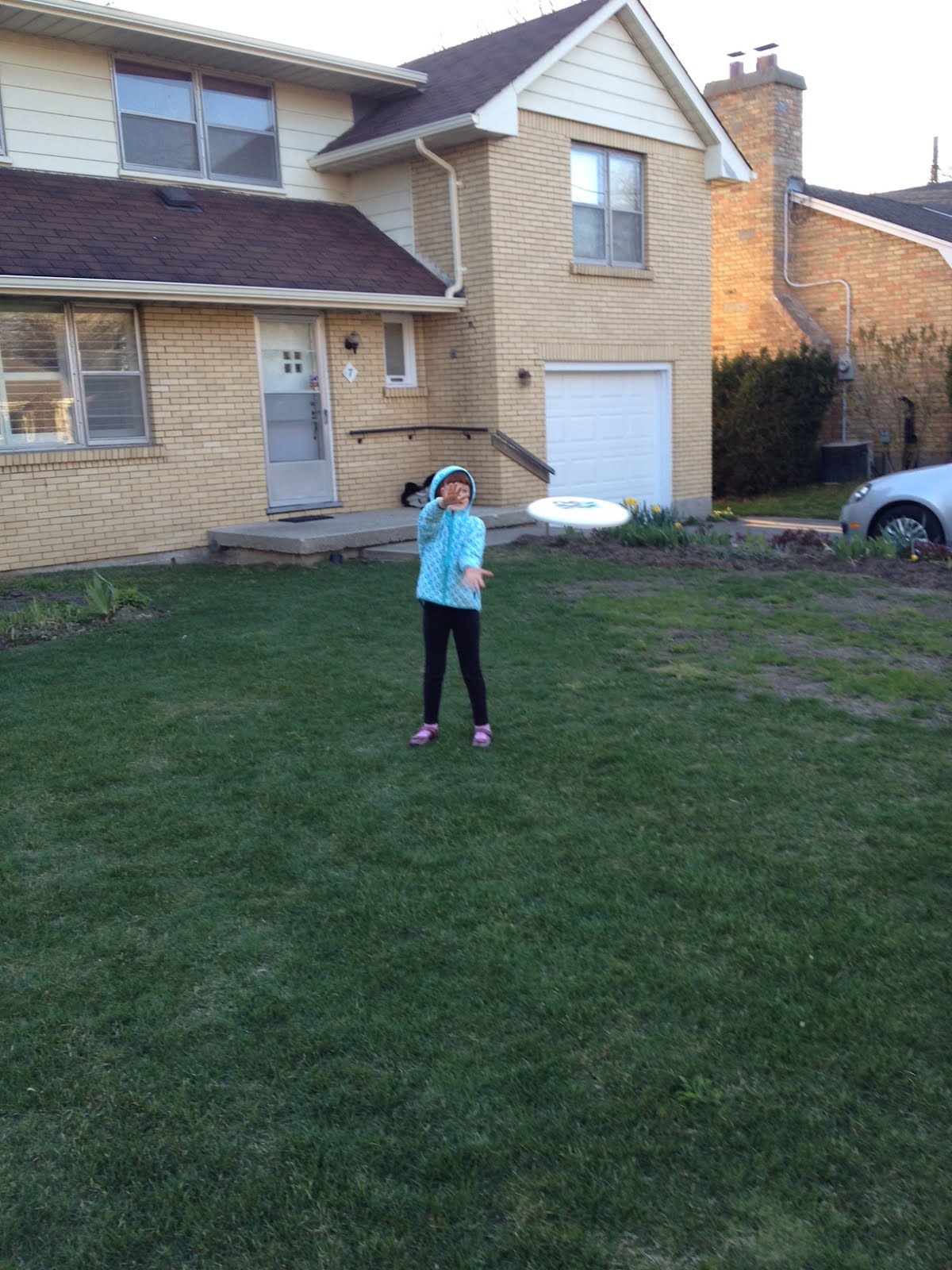 Here charlotte learning something from an adult who is not a parent or one of he teachers. (in this case a cousin and her husband). I think that, maybe, because in this experience charlotte was learning how to throw a frisbee from someone other than a parent, she was both freed up and restricted in the best possible way. Freed up to try something new and difficult without having to ask for permission or attempt it under the watchful eye of a parent and freed up from Some familiar habits – such as having a little cry after getting bonked in the face with something. And restricted because, without mom or dad around, those familiar habits or default reactions just weren't available to her when she got hit. She could have had a few tears and Nicole and james would have been quick to console her. Bu, Nicole and James are both cousins, just like she is a cousin. And so in some way, they are peers and you don't always want to cry in front of your peers. Even when you do get smacked in the chin with some cold hard plastic.