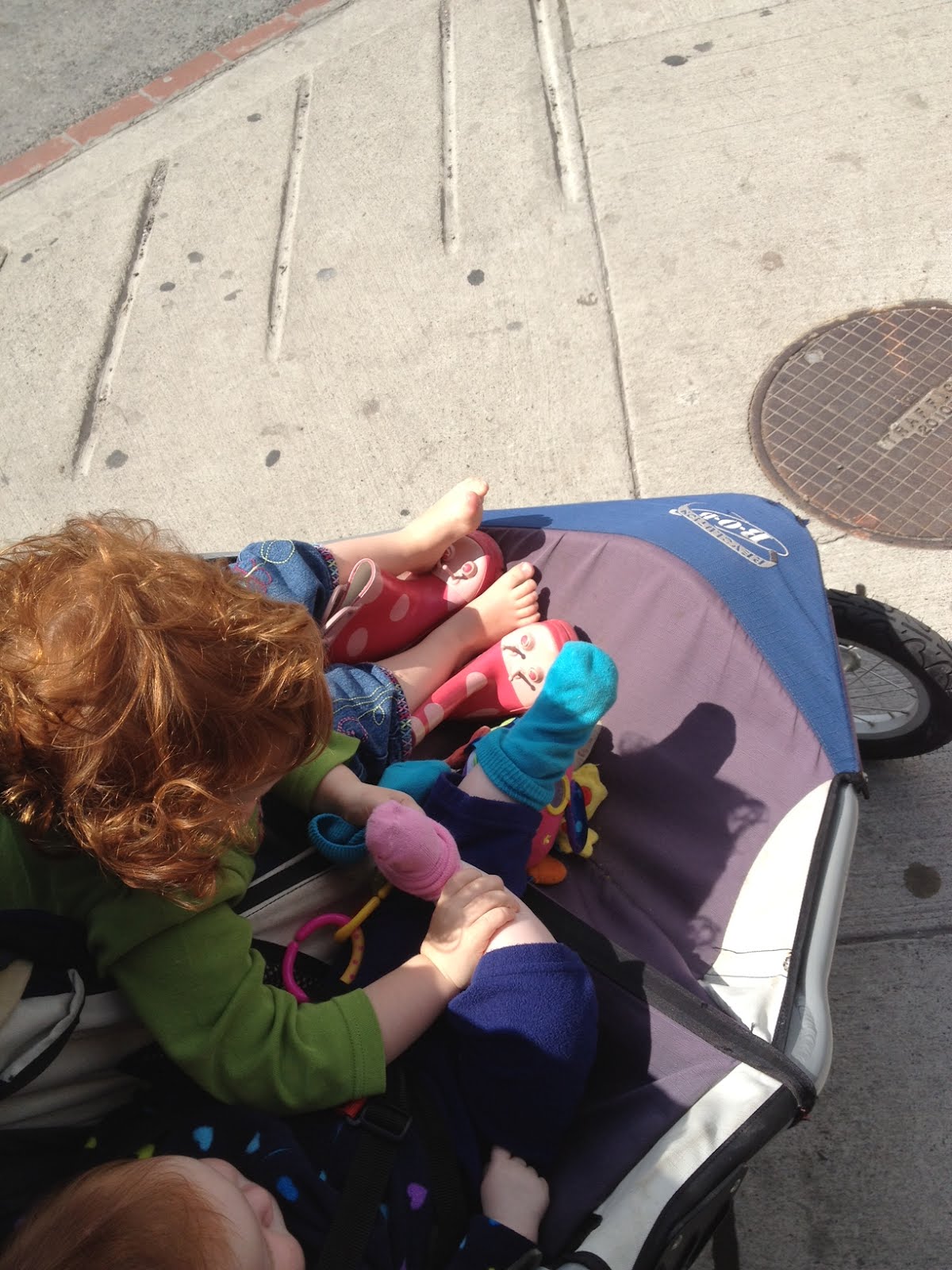 Ruby wasn't wasting any time today with the sunshine. Her boots and socks were off only moments after I picked her up from school this morning. Perhaps she was saluting the sun. Perhaps she was celebrating having made it through her full first morning of school in underwear with no accidents. Perhaps she just thought Arden's feet looked cold. There's no telling what goes on under the curls.