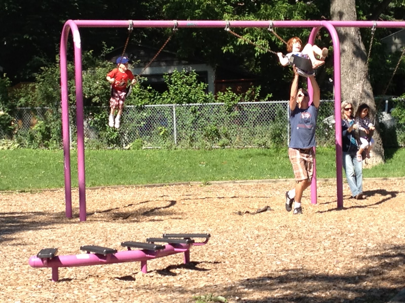 This is a picture of my new friend, Pete, pushing Charlotte on the swing. Hopefully, the picture is good enough that you can notice just a hint of slack in the chains that hold the swing up, indicating that he really didn’t hold back. You might also be able to make out the look on Charlotte’s face. Equal parts thrill and surprise. All the makings of a good underdog. To the left of Charlotte is her buddy Travis, Pete’s son.