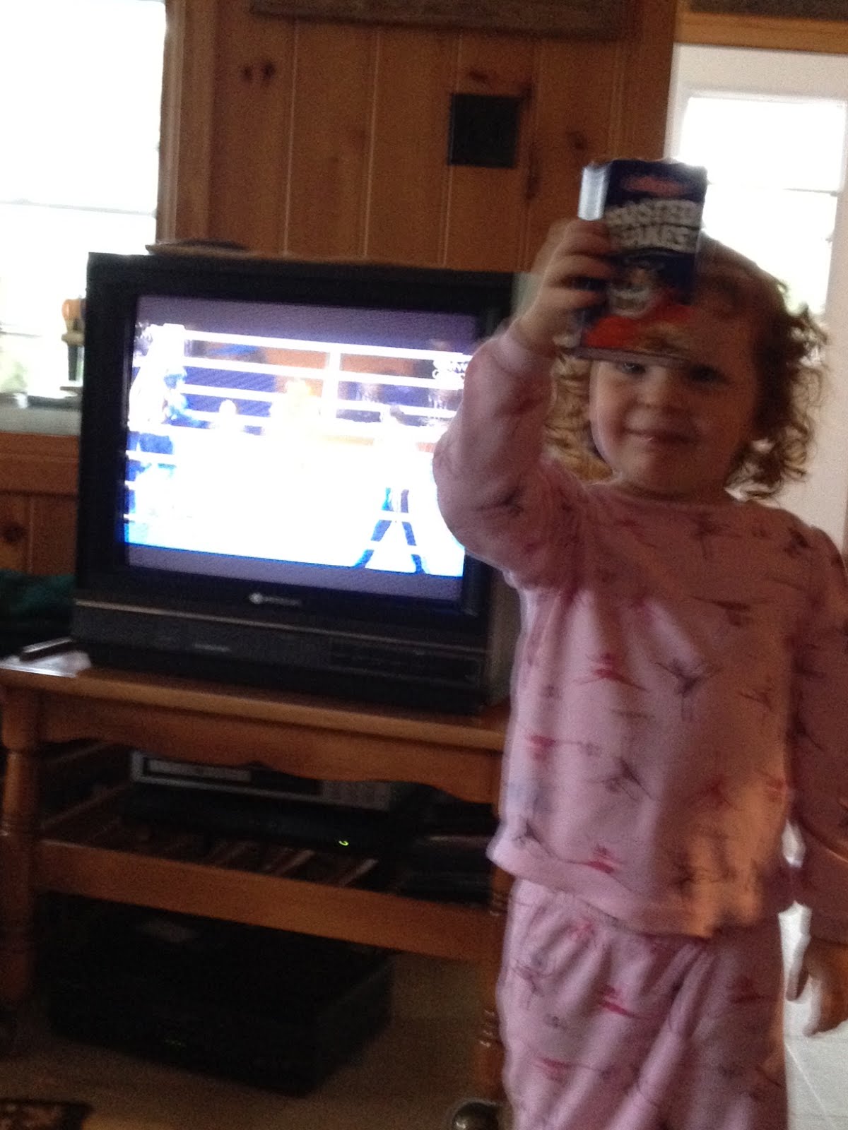 Nothing quite says summer to me than single serving boxes of cereal. We had them as a kid, and while we've been staying with my parents for the past 10days, my own children have come to appreciate just how tasty these little boxes of goodness are. It's no coincidence that there is only one box of Raisin Bran in the variety pack. How can it really compete with Corn Pops, Rice Krispies, and Frosted Flakes??? It can't. Match up your favorite sugar cereal with some early morning Olympic boxing and your newly minted 3 year old red head is pretty much as happy as she gets. And what more can we ask for from life?