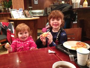 With only two of three on our hands, Hil and I felt like we were on vacation. It seems strange to say that – but its true. They are all equally demanding in their own ways – but Ruby seems to be at an awkward spot at 3.5 where she can be particluarly whinny, particularly demanding about having someone feed her, and particularly particular about just about everything. She can also be the best. It comes and it goes. But with her out of the picture for 48hours, we could revert back to man-to-man defence and take a few deep breaths. So we went out for an early evening walk with Arden and Charlotte, which morphed into a stop at the bakery for hot chocolate and pizza. As you can tell by the massive smiles on their faces, Arden and Charlotte were thrilled to be out with us, thrilled to be out with one another, and thrilled to be sharing a pizza. It was a pretty awesome way to spend a Saturday evening. Especially because we could be confident that it was a win-win-win-win situation. Win for Charlotte and Arden because they got pizza and hot chocolate, win for Hil and Drew because they had one less kid to look after. Win for Ruby, because she got lavished in attention from my parents (my mom thinks she read her 50 books during her time at their house this past weekend – and I believe it – Ruby loves to be read to). Win for my parents because Ruby is awesome to hang out with – especially when you have her one on one!