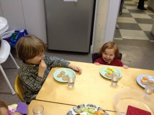 So, for a long time Arden has had snack with the rest of the kids in ruby's group while sitting in a high chair but today I was feeling a little lazy and did t want to have to clean up the high chair tray afterwards so I just sat her down on one of the regular chairs at the table and she loved it! Ate like a champ and yammered away through the whole snack with the other kids.