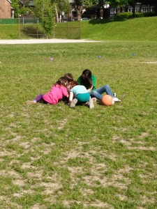 She is picking up tiny blue beads out of the grass after her friend fell, skinned her knee, broke her ankle bracelet, and had a minor melt down at the loss.