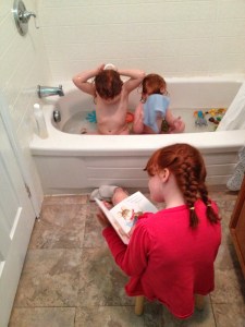 Charlotte is a reluctant reader and not very motivated to get better. She's moved leaps and bounds this year at school – especially considering she has made the transition from French immersion – but she hasn't really caught the bug yet. Tonight she offered to read to the little sisters while they were in the tub. To be honest, I'm not convinced the little sisters were paying attention. And, the book was a rhyming book so ruby was constantly interrupting with the rhyming words that she was anticipating would end each sentence. You can imagine how this went over with Charlotte. Regardless – it saved me having to accept a never ending supply of bath water tea in mini tea cups and make orders at the bath cafe. It was a nice moment.