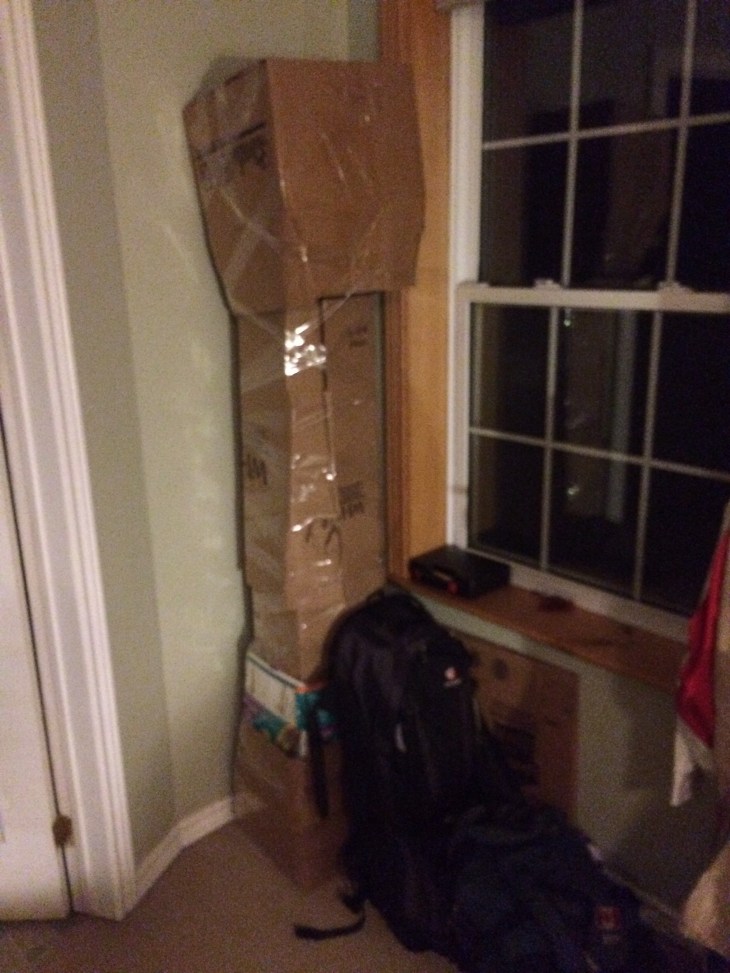 In this picture we see Jane Smith’s grandmother clock encased in cardboard string and packing tape along with my 85 L backpack it will soon be leaving this country for an unknown period of time. A fitting scene for the end of today.