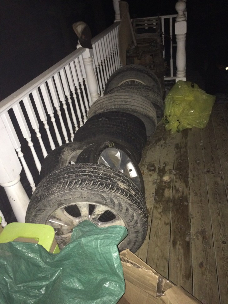 It is a case of Ernie and the fishbowl: these are my summer tires and they are on the deck of the house where we live because they need to dry out; They are here because when i brought them home from the shop I didn’t have a good place to store them so I left them I n the driveway. Then it snowed. And now they need to Go into storage but they are wet and I don’t want to put them in storage wet so they are drying out; and I had to make 8 trips up and down the stairs from the driveway to put the metre and waste a whole bunch of plastic bags just in the intern in the garbage because of my negligence. All of this when I could have been doing something more productive. But I suppose it’ll all get done.
