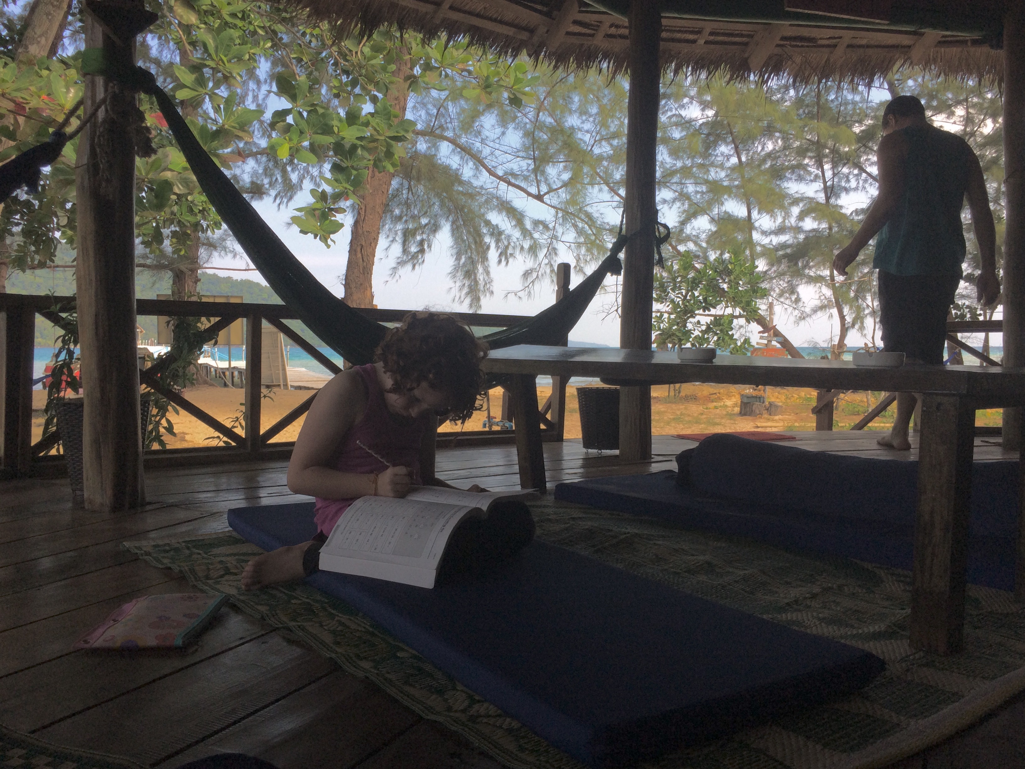 We did our homework every day of our trip to Koh Rong Samloem. From 9 AM until 11 AM the hotel bar (Think open air yurt) complete with cushions, rattan mats, and hammocks became our study hall. Watch for Charlotte’s upcoming post on her interview with Alan, the hotel manager.