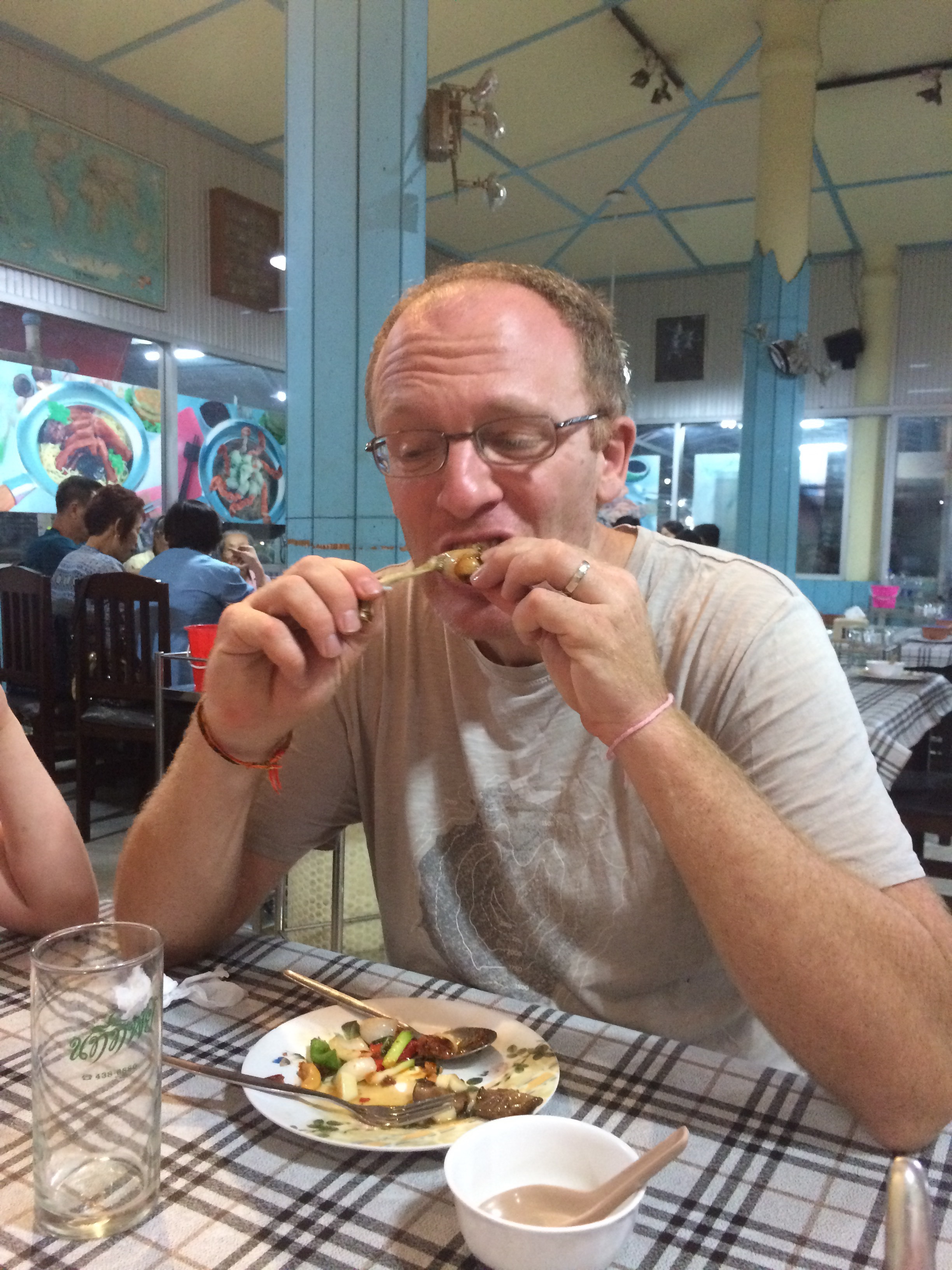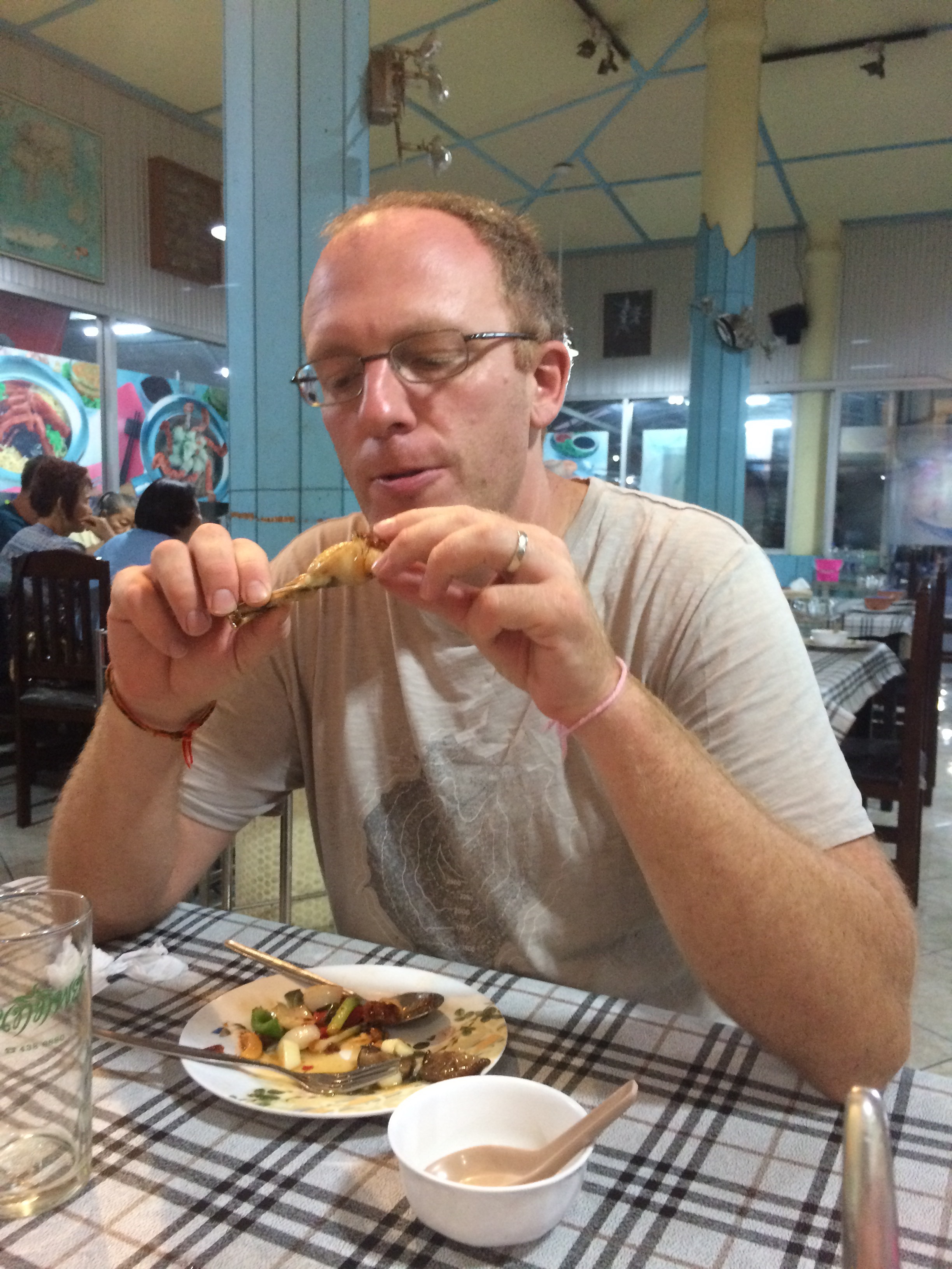 But I’m way off topic – back to dinner. The bike ride was physically and mentally demanding and we needed a place for dinner within walking distance of the hotel. Hil nailed it by finding a place that was just about 500m away and filled with locals which we always interpret as a good sign. The menu was extensive with all kinds of Thai delights and for some reason or another, the one that was calling out to me tonight was frog.