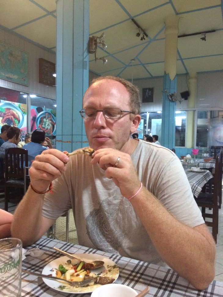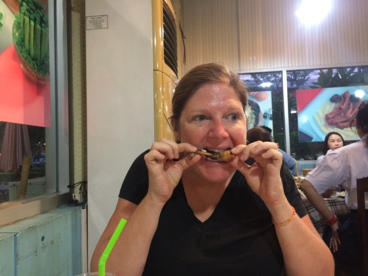 Let’s back up a minute. For the year preceding our departure I ate an almost vegan diet. I cheated on the diet at Christmas, at Thanksgiving, and when I ate the smoked pork chops from Maple Grove Farm, and a few other times too. I wasn’t much of a vegan. I was more of a flexatariane. And, truth be told, this trip has really made me want to get back to a less environmentally taxing diet – but that’s a blog post for a different day. On the other hand – one of the most amazing things about Asia thus far has been the food and everything is on the menu. So tonight it was frog!