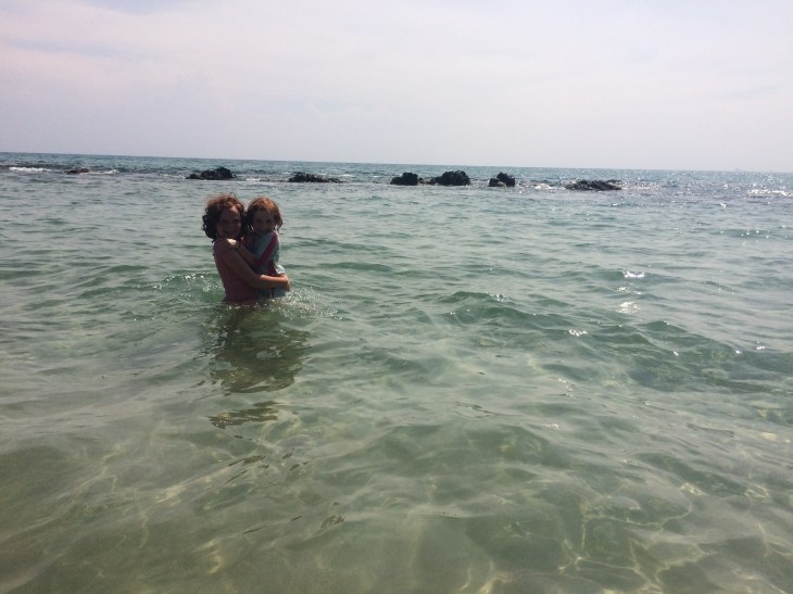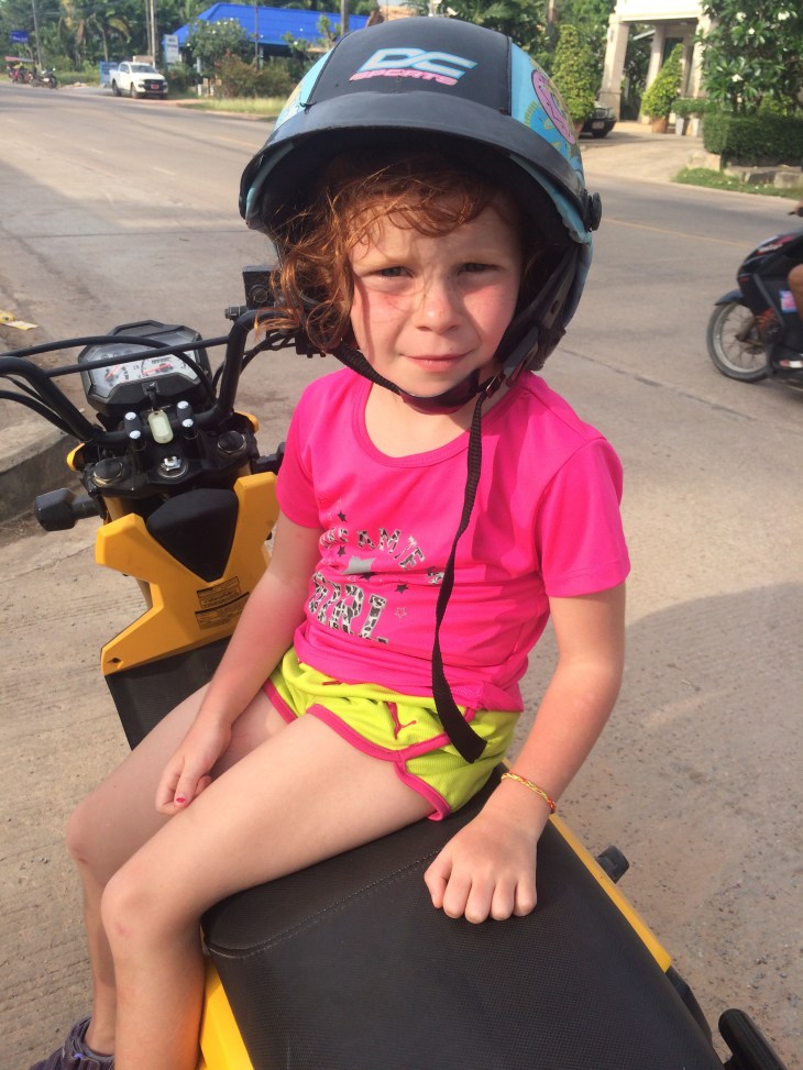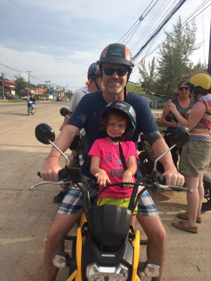 Three scooters. 7 helmets. 1 second breakfast of incredible fruit smoothies. 1 very tasty Thai lunch at a table beside the ocean. 14 scorched foot soles – the sand was so hot. 1 massage. 1 very leisurely post lunch swim – in fact we probably can’t call it a swim – it was more of a float. 1 brief sandplay. 7 very tired adventurers who ate half bags of chips and bananas pirated from this morning’s breakfast buffet and then went to sleep around 8pm!