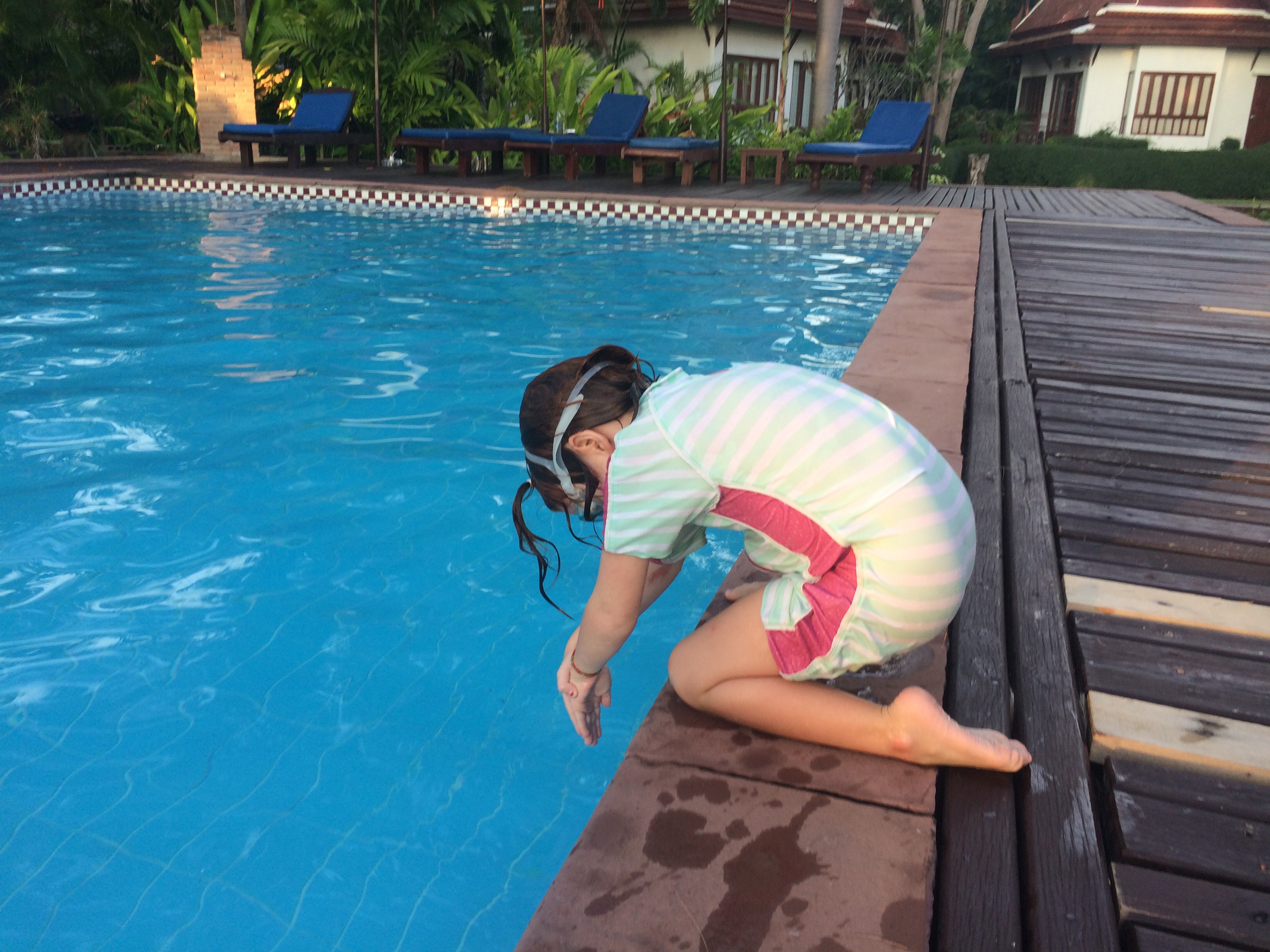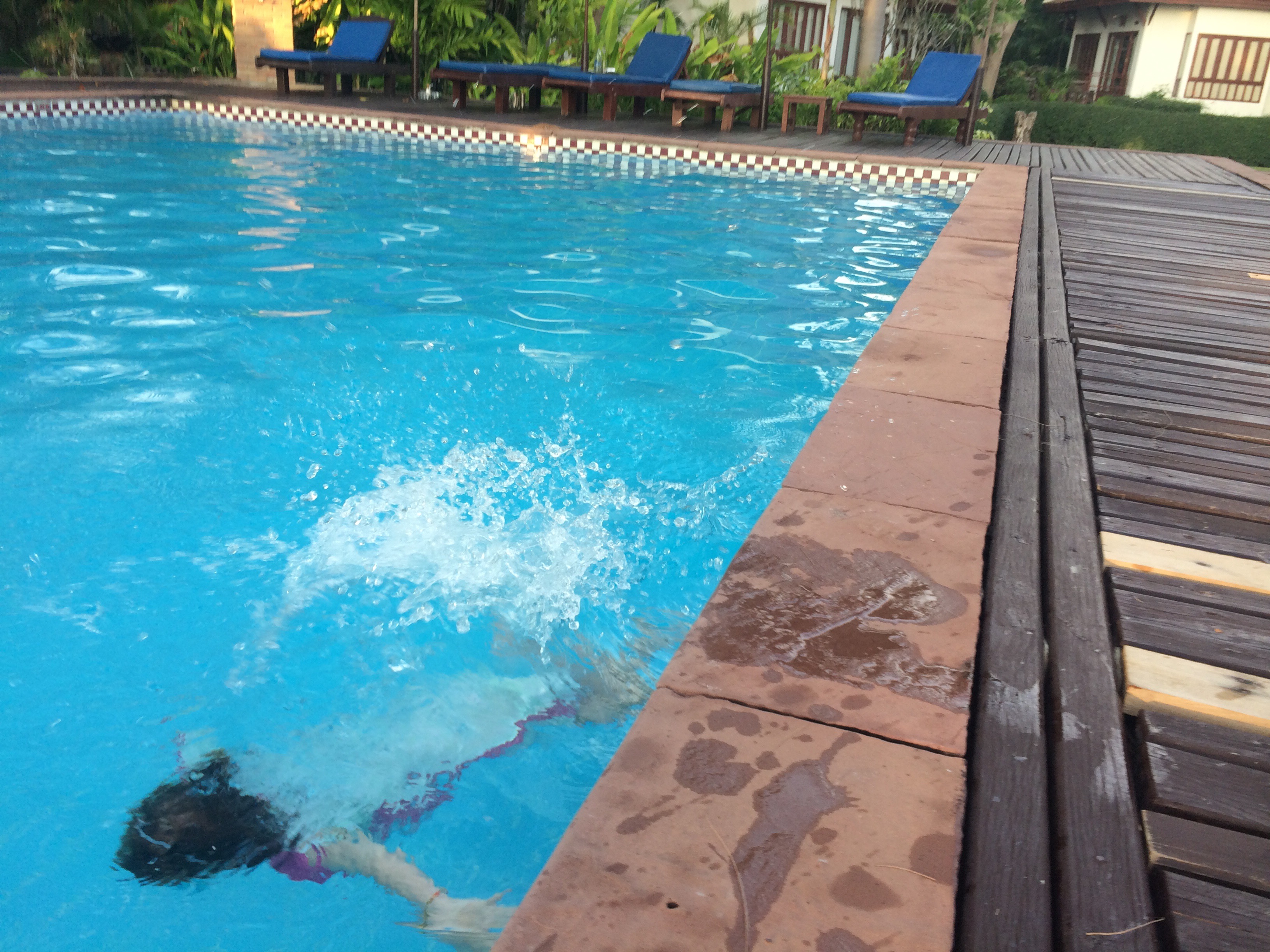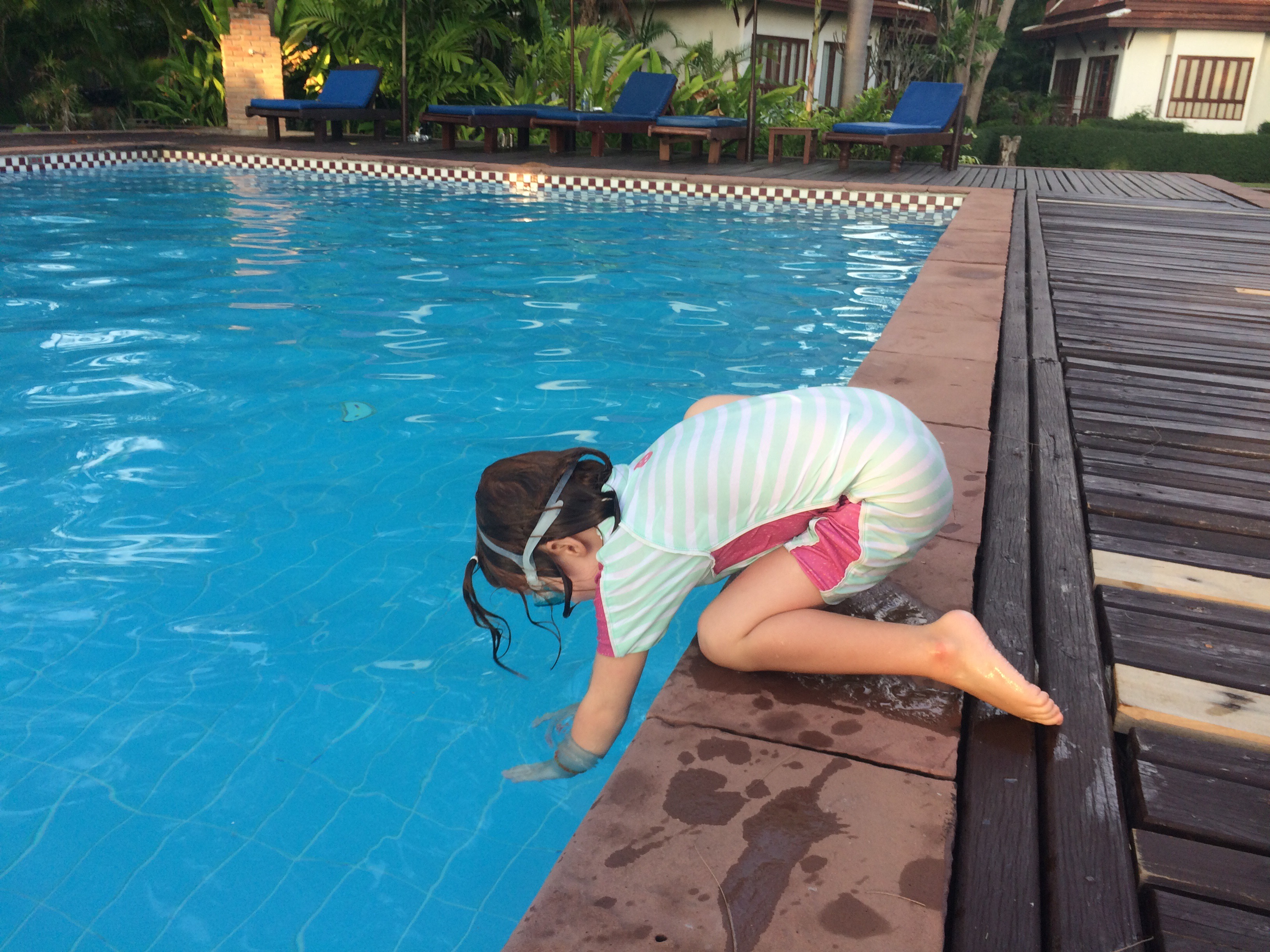 Arden loves jumping in the water. Today alone she must have jumped in between 75 and 100 times. No exaggeration. Up until arriving in Thailand her jumps into the water have been kind of uncoordinated. She mostly just adopts this flying monkey star shaped stance in the air as though she is ready to grab on to some post or vine to stop her fall. It has the same effect as a stride jump when she hits the water and she has mastered keeping her head above water when she jumps in. But that has all changed in the span of a week here. She is now doing pencil jumps, cannon balls, and, as of today she has figured out how to dive. The astonishing thing is that it only took her two tries to get it. When I took this series of photos I was fully expecting to get a string of pictures that showed the classic learning to dive leap that inevitably ends in some form of belly flop for most kids. And she totally took me by surprise.