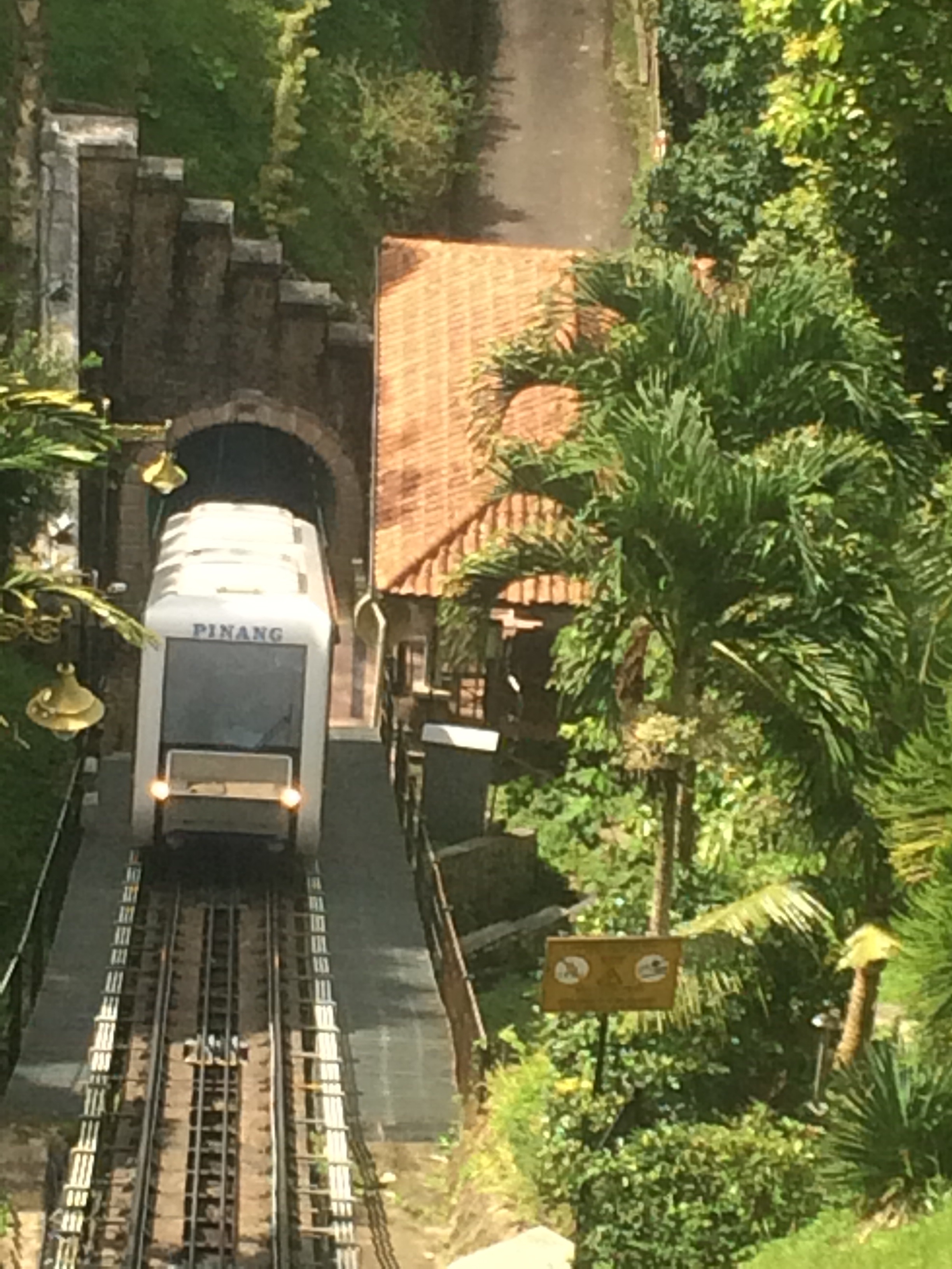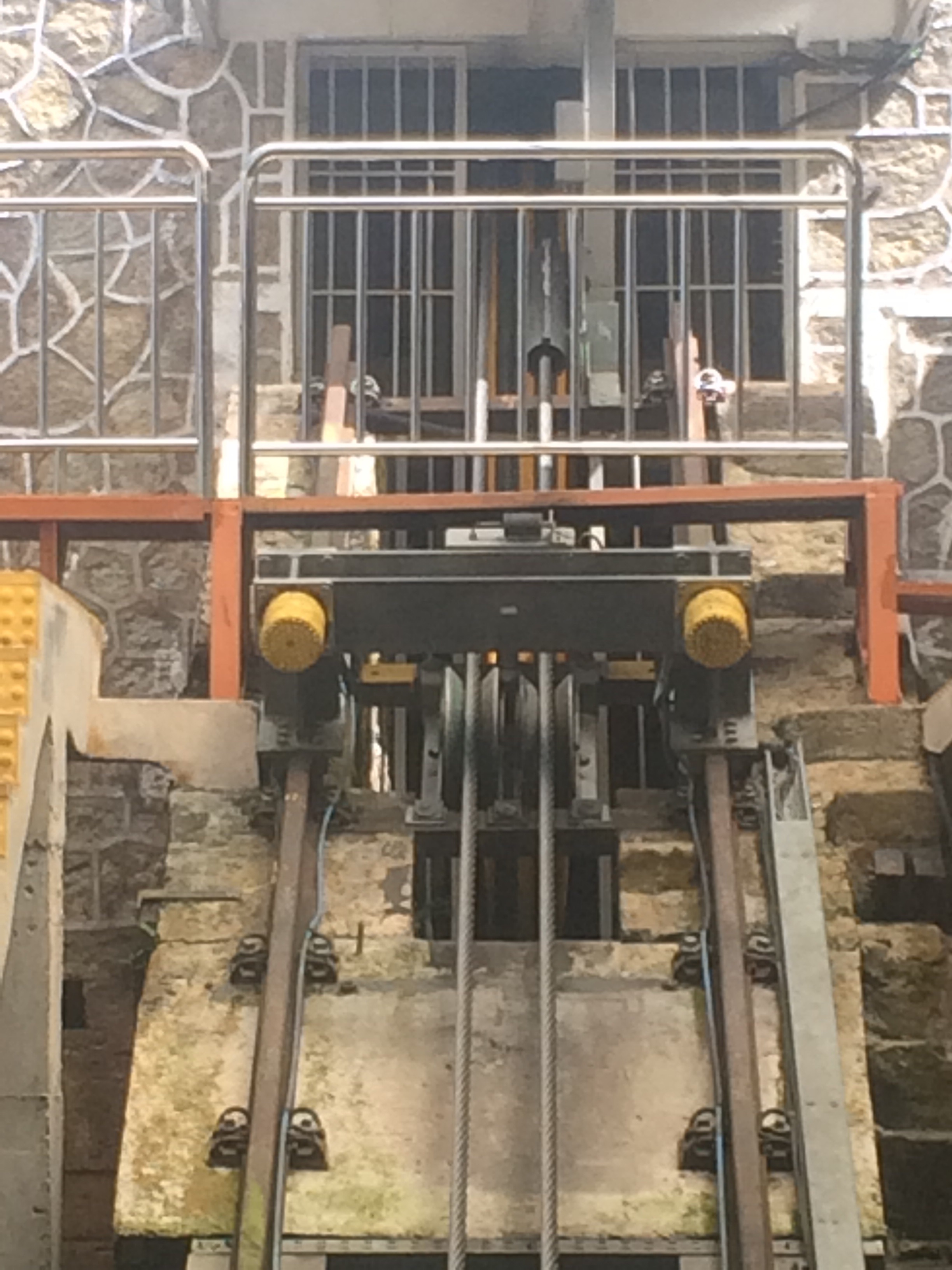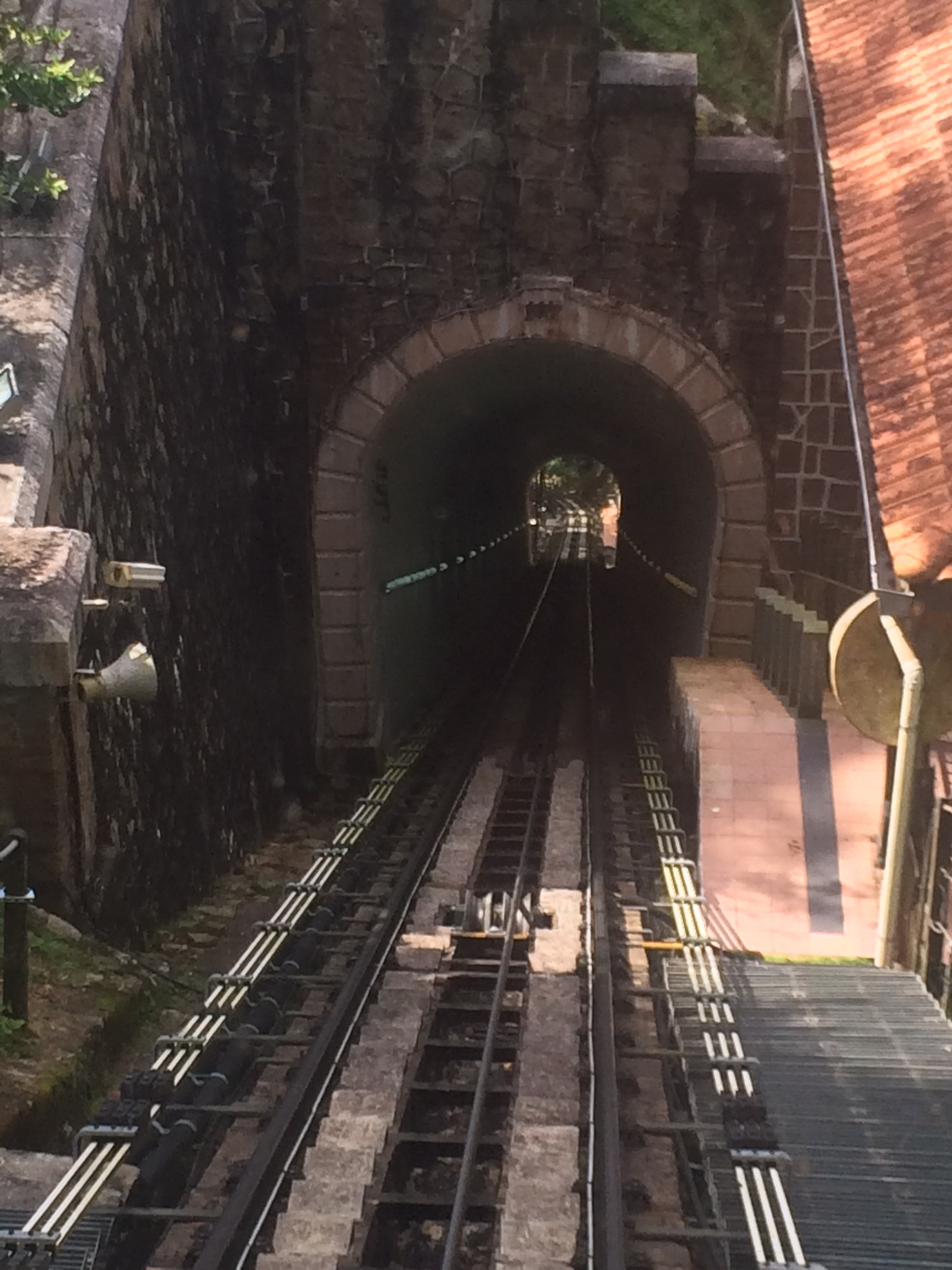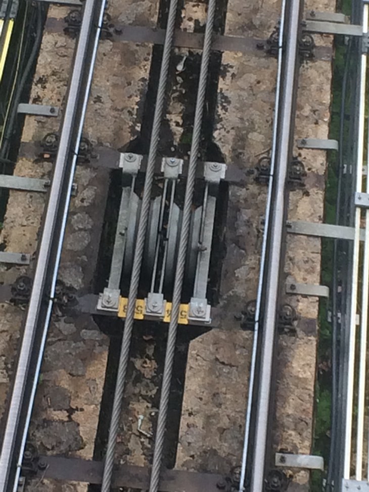 This is how the feniculer works. First both cars fill up then the guards give the all clear thumbs up sign and the cars start to move. At the siding, the cars each go on a side but I think that the driver needs to hit a button that changes the tracks then they hit it again and then you go down some more and you are at the station.