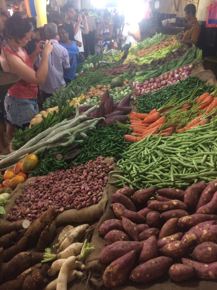 First, We went to the market to get out ingredients. We traveled by tuk tuk. We saw watermelon, carrots, fish, potatoes, tomatoes, beans, pumpkin, scotch bonnets, spiced, papaya, cabbage, and mango.