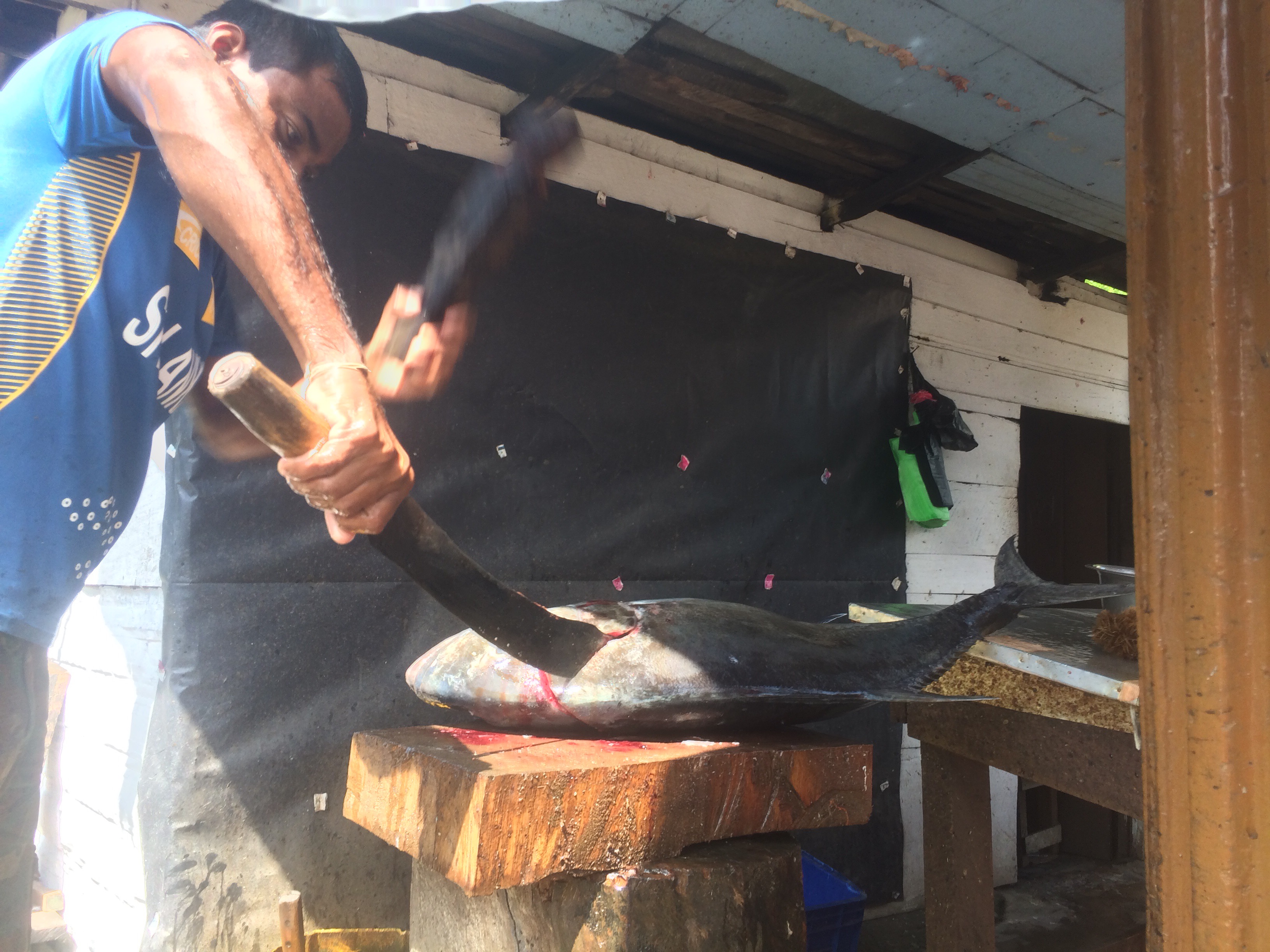 The fish monger cut the head off and stuck his hand inside and pulled out the guts. He used the leg of a chair as a mallet to hammer the knife through the fish. He sharpened his knife on a roof shingle.