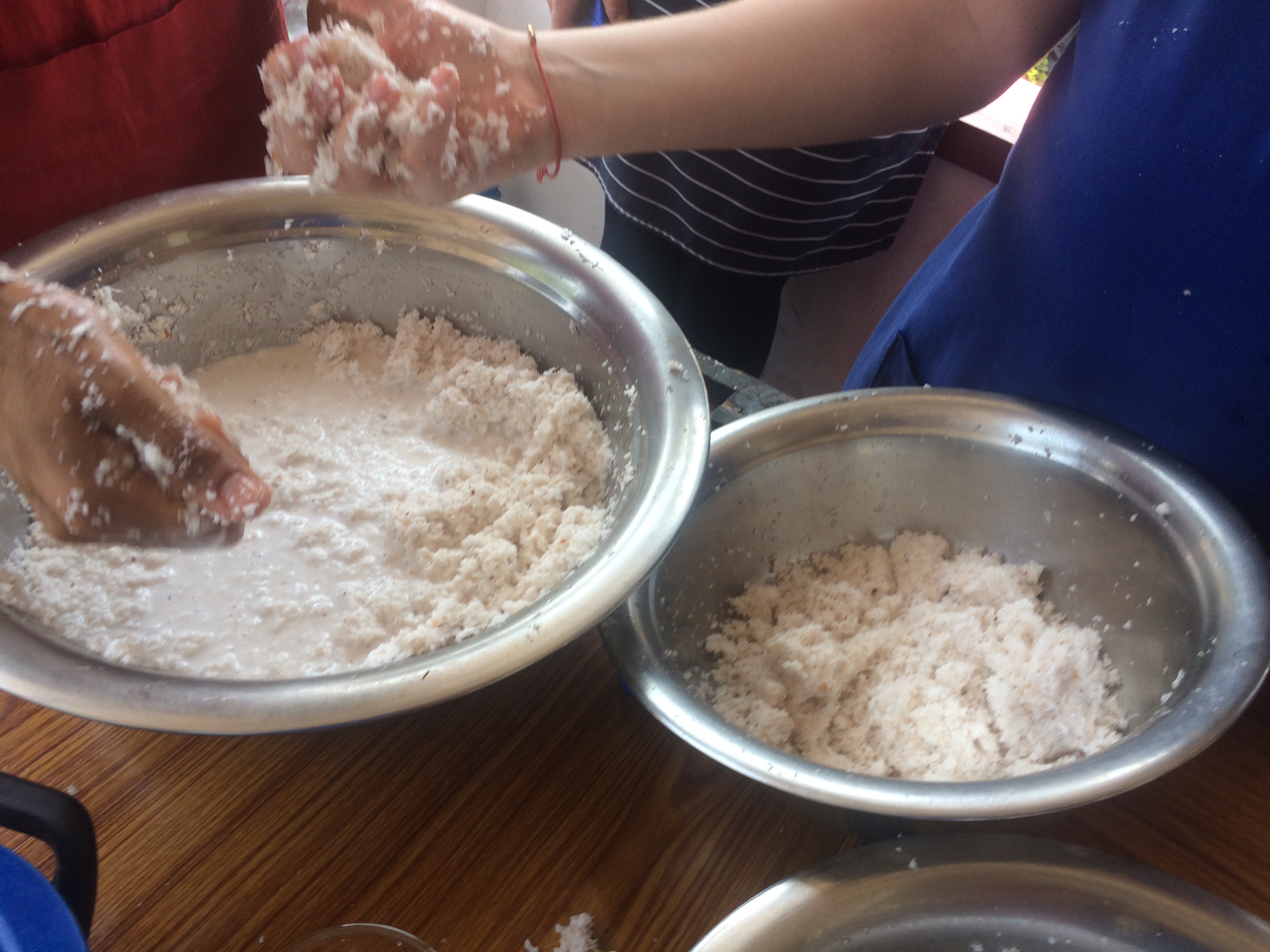We returned to the cooking school. We used a coconut mill to drill out the coconut from the shell. The drill worked by spinning a handle attached to sharp blades and the machine worked like an egg beater. We used the shredded coconut (that looked like snow) to make coconut cream. First we added water to the shredded coconut. Then we mixed it all together. Then we picked it up and used our right hand to squeeze out all the water. We put the pressed coconut in a separate bowl and added water again and did the same process to get coconut milk.