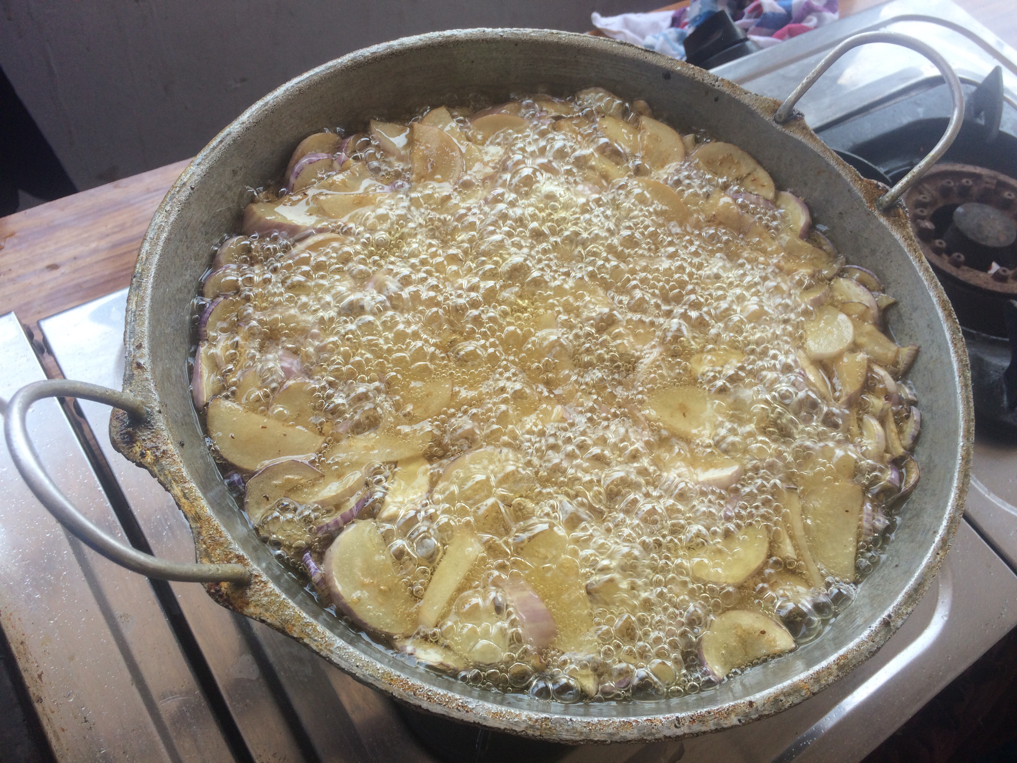 Next we thinly sliced aubergines and deep fried them in oil.