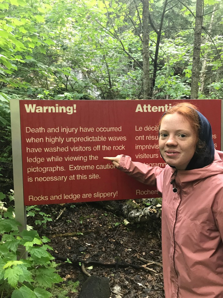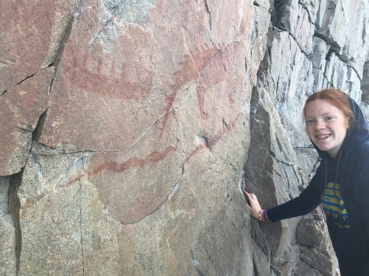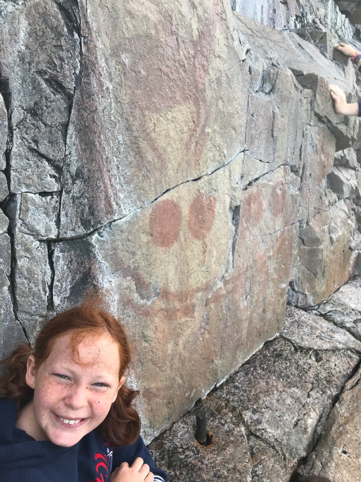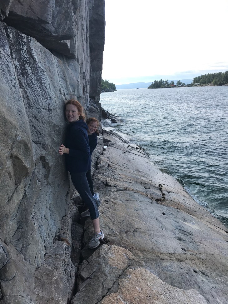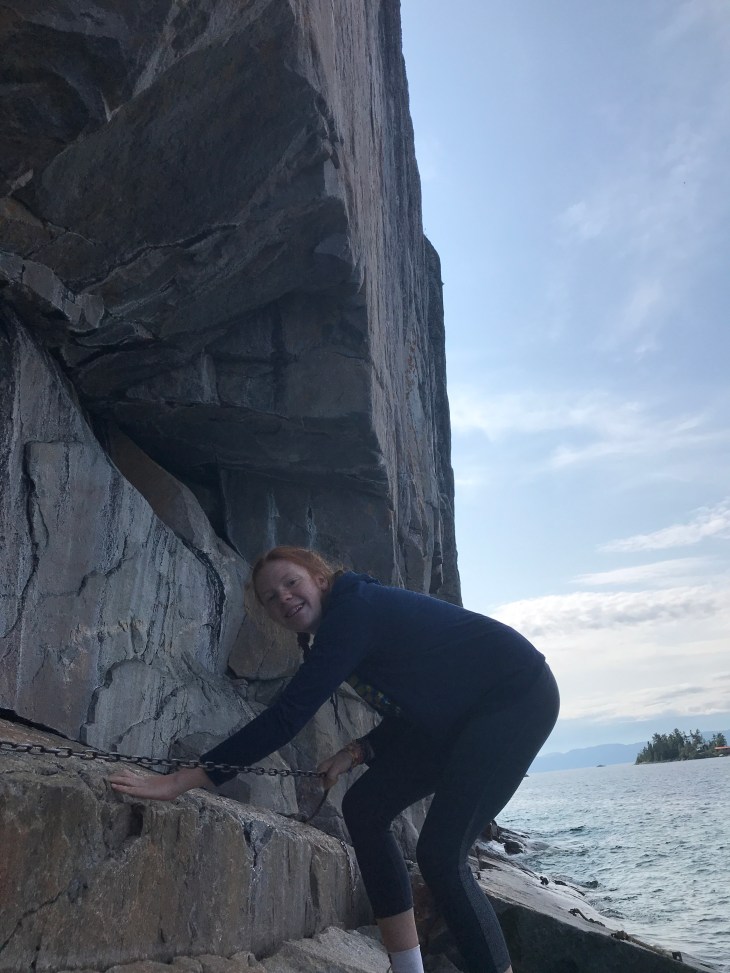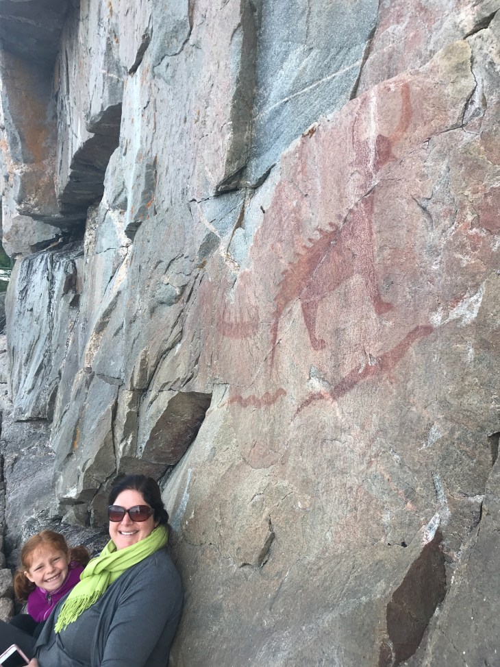 These images are estimated to be between 150 and 400 years old. They are at the bottom of an enormous cliff and at the very edge of Lake Superior. I totally understand how people have died here. Nonetheless – Lake Superior was with us this morning and she made it possible for us to get an excellent look at these images. And we are grateful she did – we had plenty of interesting conversation about how the images got there in the first place, how they’ve lasted there for so long, why these are called pictographs and not frescos (we don’t have a good answer) and the big one: what do they mean?!?