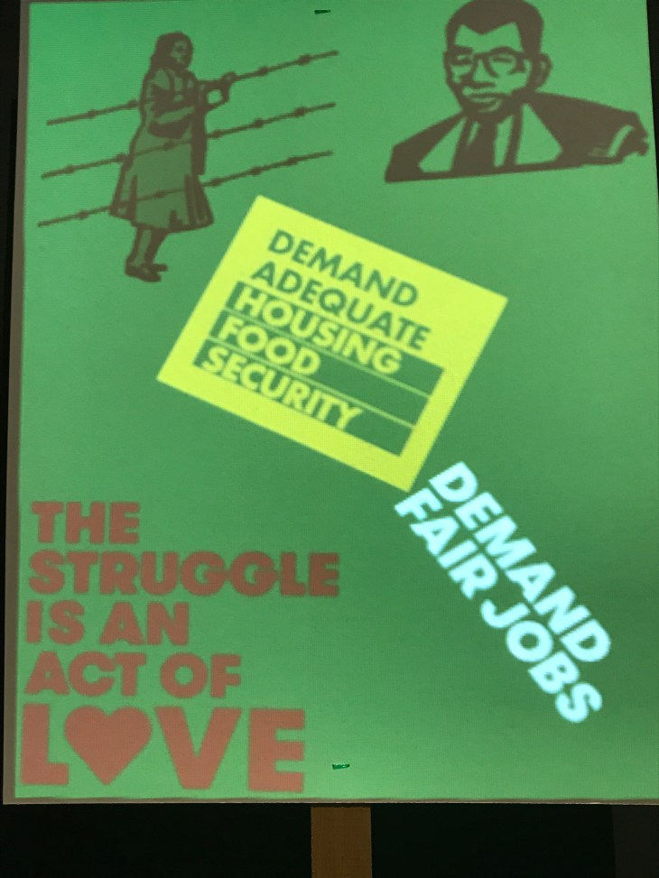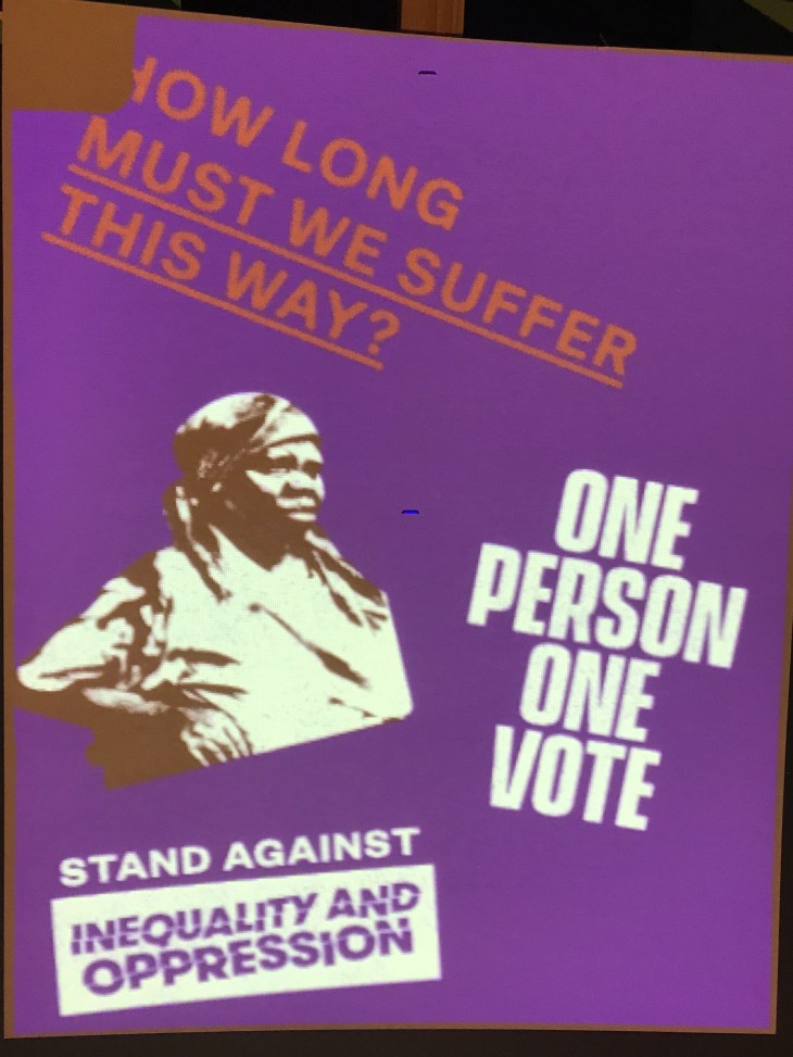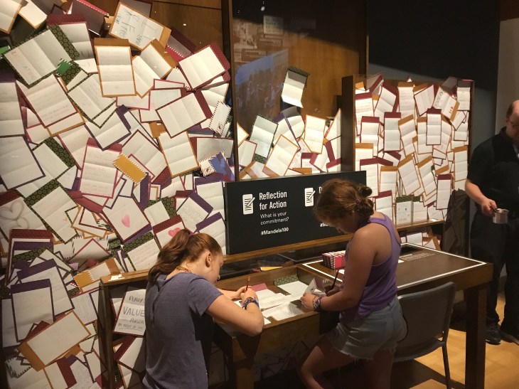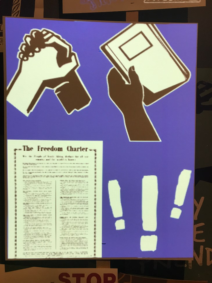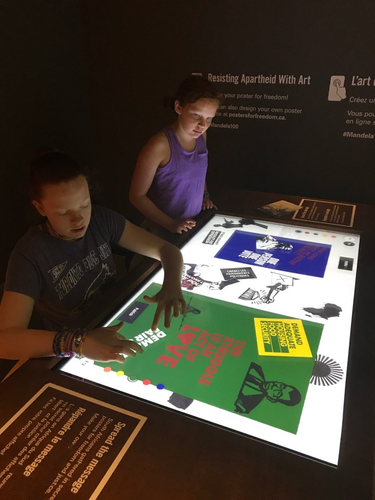 Most of the exhibits have some form of interactive element to them that is designed to either inform or promote action. Each of the girls designed their own apartheid resistance poster at the Mandela exhibit. Charlotte and Ruby on a large smart table and Arden on an iPad. Posters here go C, R, A.