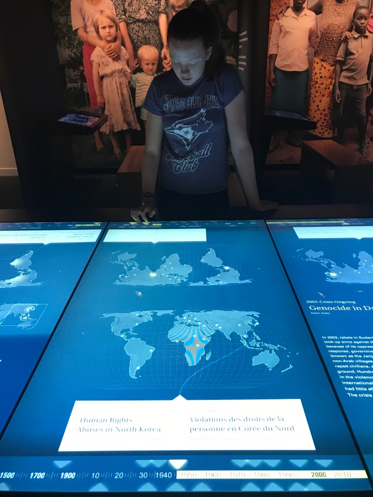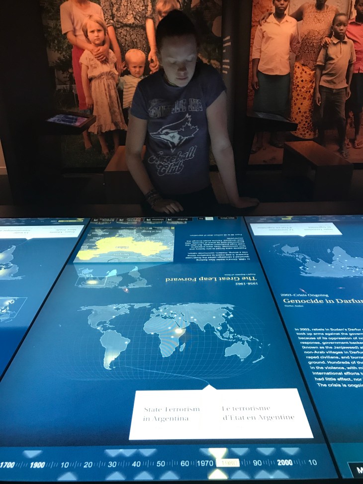 Many of the images in the museum were hard to look at. Including images from the Holocaust, the Holodomor, the Khmer Rouge, residential schools, and Japanese interment camps. Other images were uplifting. Same sex marriage, the celebration of the struggle of Viola Davis, Canadian peace keeping efforts, the release of Nelson Mandela from prison. Hil and I were both grateful to have the time, space, and well curated prompts to have conversations with our daughters about some very difficult topics.
