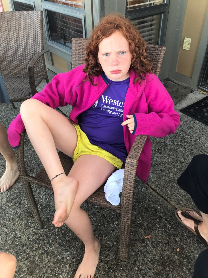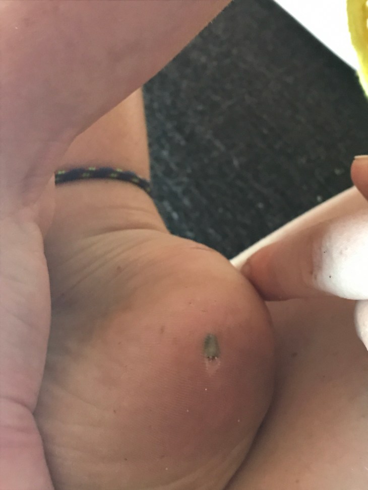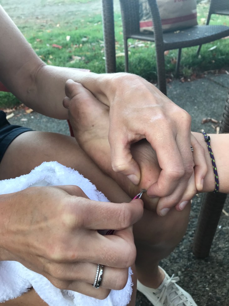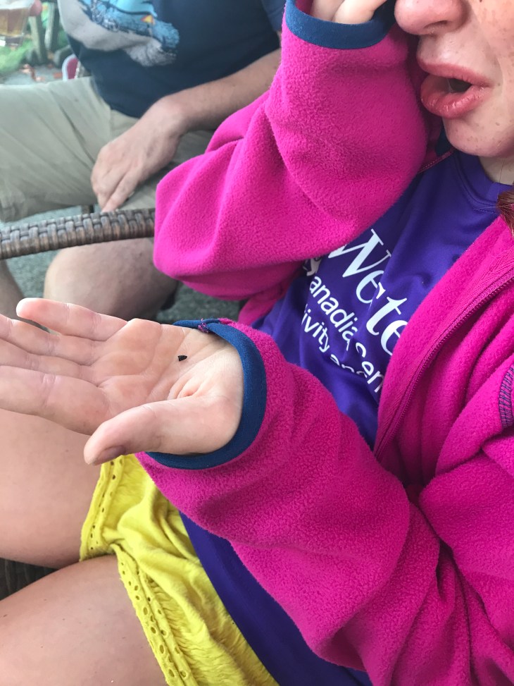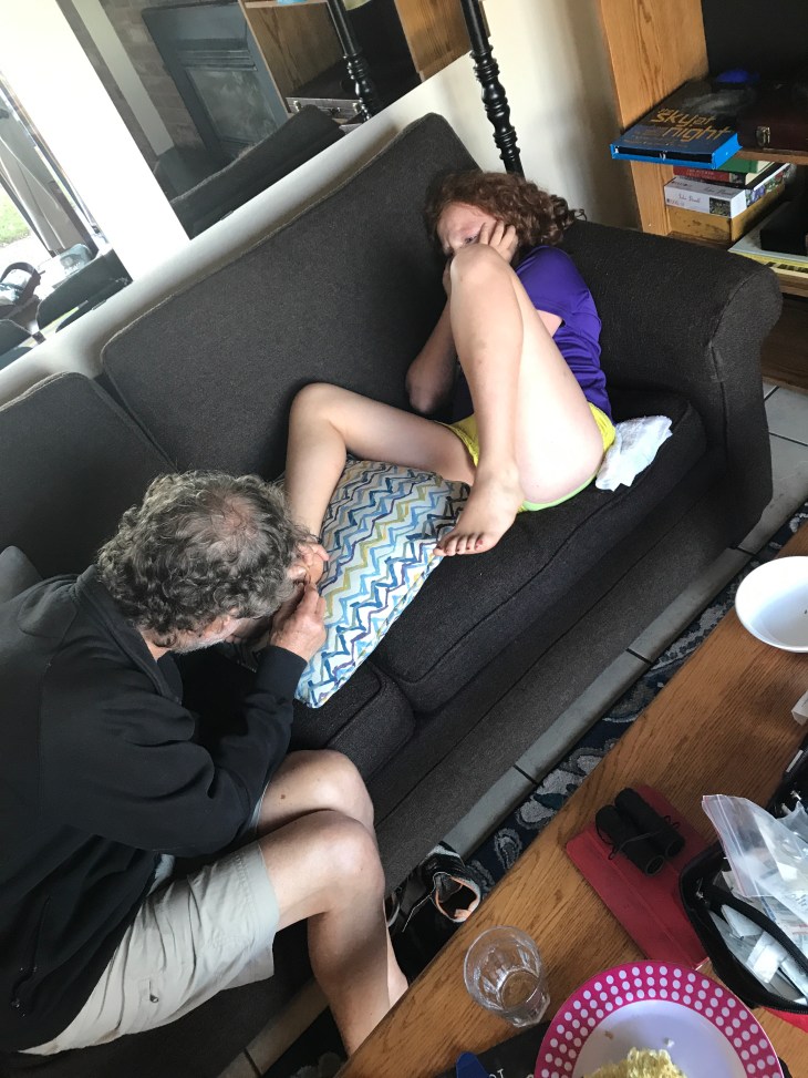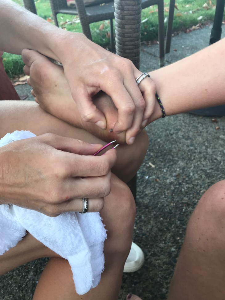 Ruby got a substantial sliver in her foot while walking down to the beach after a skillfully prepared summer feast. (Stay tunes for a public safety announcement about the benefits of wearing shoes). It appears to be spine-like. Perhaps it is the thorn broken off a local inhabitant. Perhaps a random shard of shell set free from its mollusc by the random tumbling of the ways. Perhaps I prefer to think of it as a fossilized shard of some ancient predator of the depths. Regardless – it was painful and it had to come out.