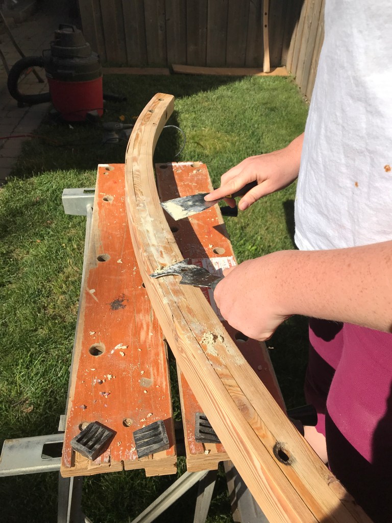 On Saturday, I had some homework to do but I finished late afternoon and headed outside to work on the project with Char. I wanted her to use wood filler to patch up cracks in the laminated pieces. I need to keep water and mould out. She worked at that while I finished the sanding and also set to work preparing the plywood strapping that I have begun laminating on in an attempt to provide greater structural integrity.