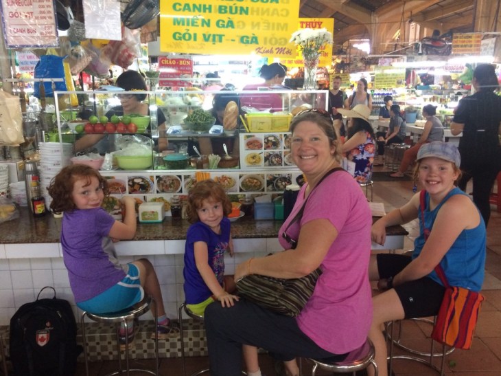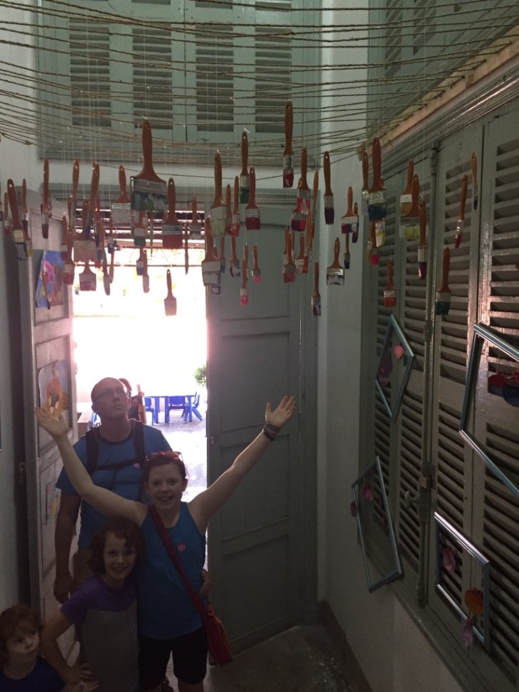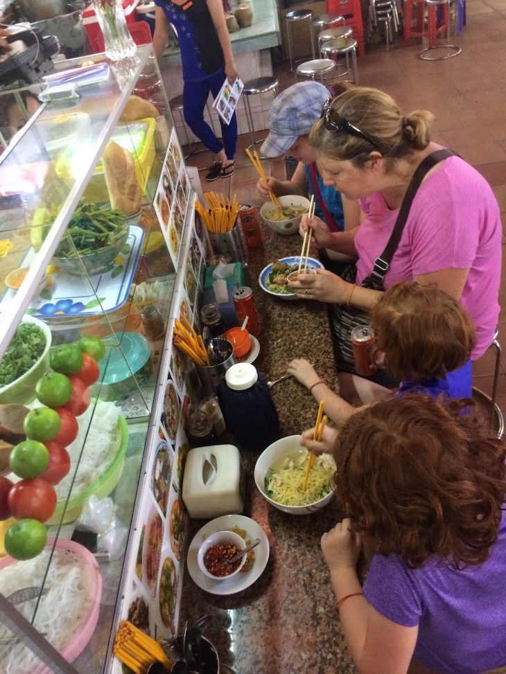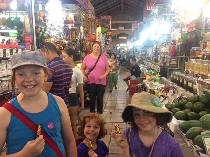 Yes happy 😊 ❤️❤️❤️’S day .. what a day you had ‼ loved all the art but especially the masks Arden is funny ‼ so you are in ho chi min city .. I was there but don’t remember the market .. aren’t they fun ?? Everything to buy !! I guess you are all really good by now at using chopsticks!! Your lunch looks YUMMERS love to you all I wake up waiting for your posts love A.J. 😘😘😘